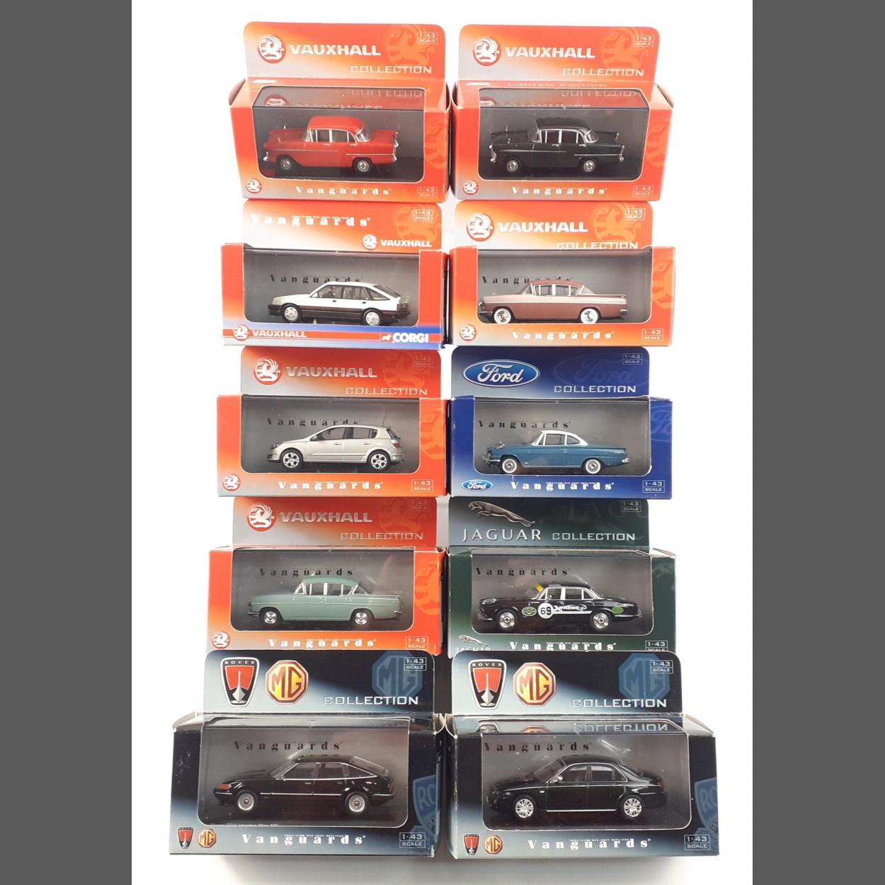 Ten CORGI VANGUARD model cars in original boxes to include VA03800 Vauxhall Victor F Series Gypsy Red, VA03809 Vauxhall Victor F Series Metallic Chrome Laurel Green, VA09800 Vauxhall Cavalier SRi MKII Polar White, VA06400 Vauxhall Cresta PA Dusk Rose & Lilac Haze, Vauxhall Astra Star Silver, VA06408 Vauxhall Velox Alpine Green, and from the Rover/MG 1:43 scale collection VA 09000 Rover SD1 Vanden Plas EF1 Black, VA09200 Rover 75 British Racing Green, from the Jaguar Collection -VA 08606 Jaguar XJ6 Racing, and from the Ford Collection VA03406 Ford Capri 109E GT Aqua Blue & Ermine White