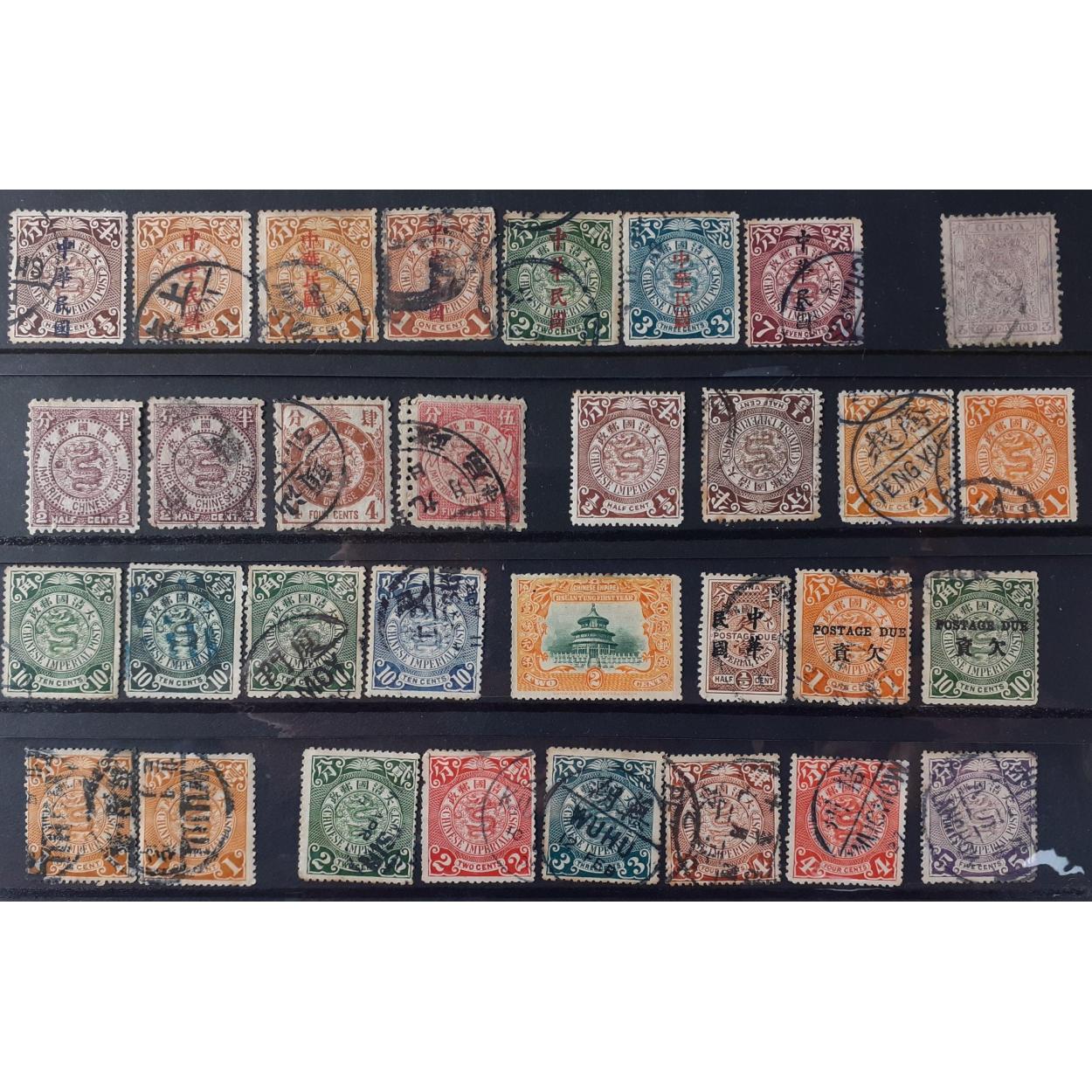 IMPERIAL CHINESE POST PRE 1912 postage stamps - COILING DRAGONS - postmark, shading & printing interest - 32 stamps in total - from 1/2 Cent to 10 Cent - to include also an interesting 3 CANDARIN mauve stamp - all on 4 cards