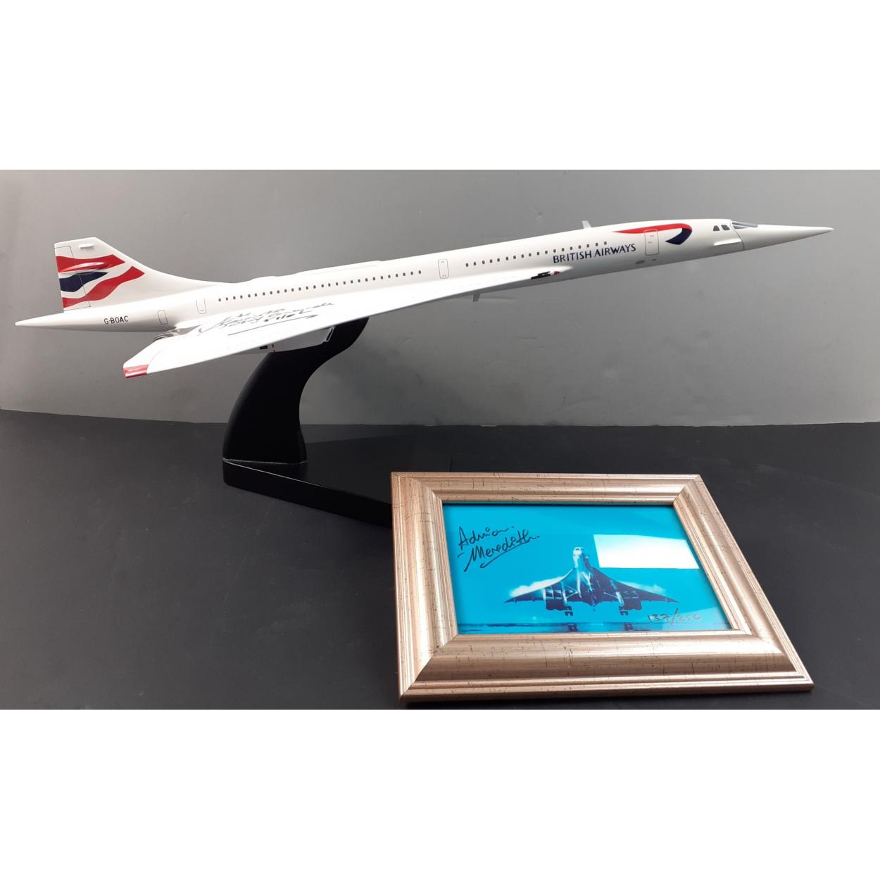 A signed pilot CONCORDE aeroplane model and accompanying limited edition (137/250) framed photograph signed in black marker pen by photographer ADRIAN MERIDETH showing Mike Bannister chief pilot actually piloting the plane! - pilot Mike Bannister - born May 1949 is an airline pilot. He is best known as the Chief Pilot of British Airways' Concorde fleet, a post which he held from 1995 until its withdrawal from service in 2003.