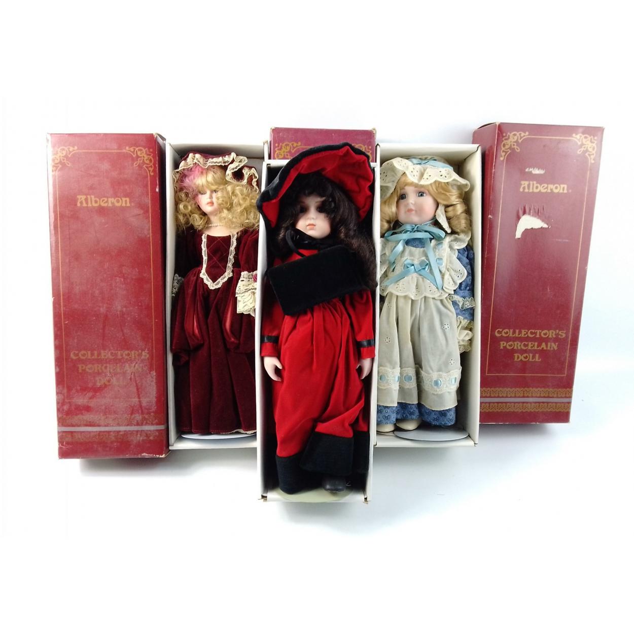 Three ALBERON COLLECTABLE DOLLS each 16" high, on stands. Dolls in good condition. Boxes with wear