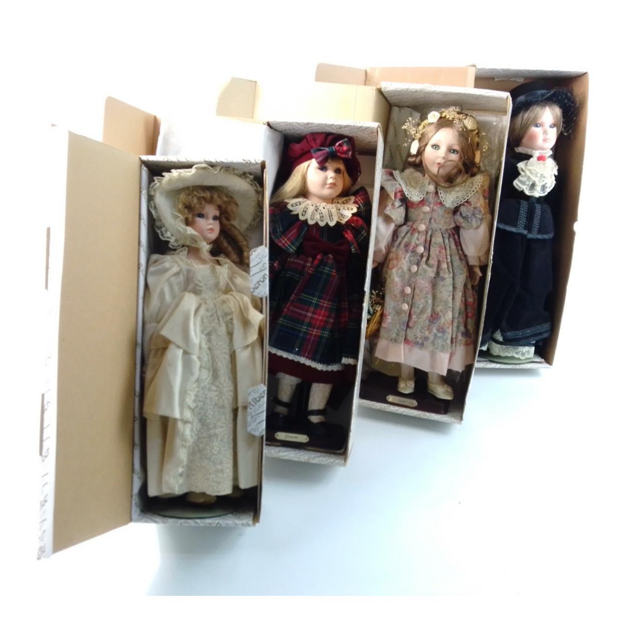 Four ALBERON COLLECTABLE DOLLS including Rachel (17") and 2 at 16" one called Gemma, on stands. Dolls in good condition. Boxes with wear