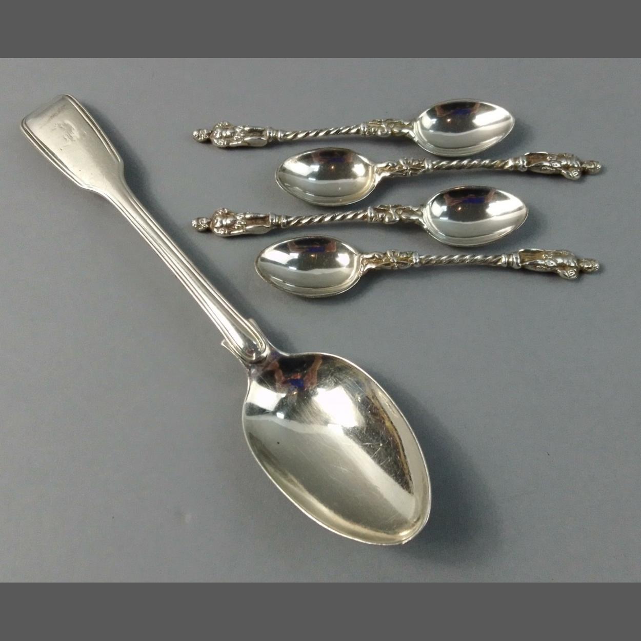 A beautiful set of four apostle style spoons with twist stems hallmarked Chester 1911 maker's mark MF, weight 51g approx, plus 1 Victorian London hallmarked dessert spoon weight 56g approx