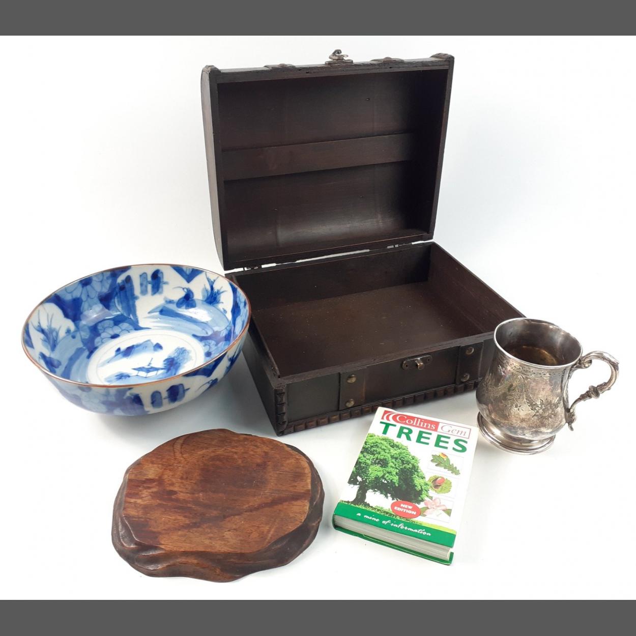 A useful wooden pirate's treasure chest casket measuring 26x20x11cm, with a 20cm Oriental bowl as found, an EP jug etc