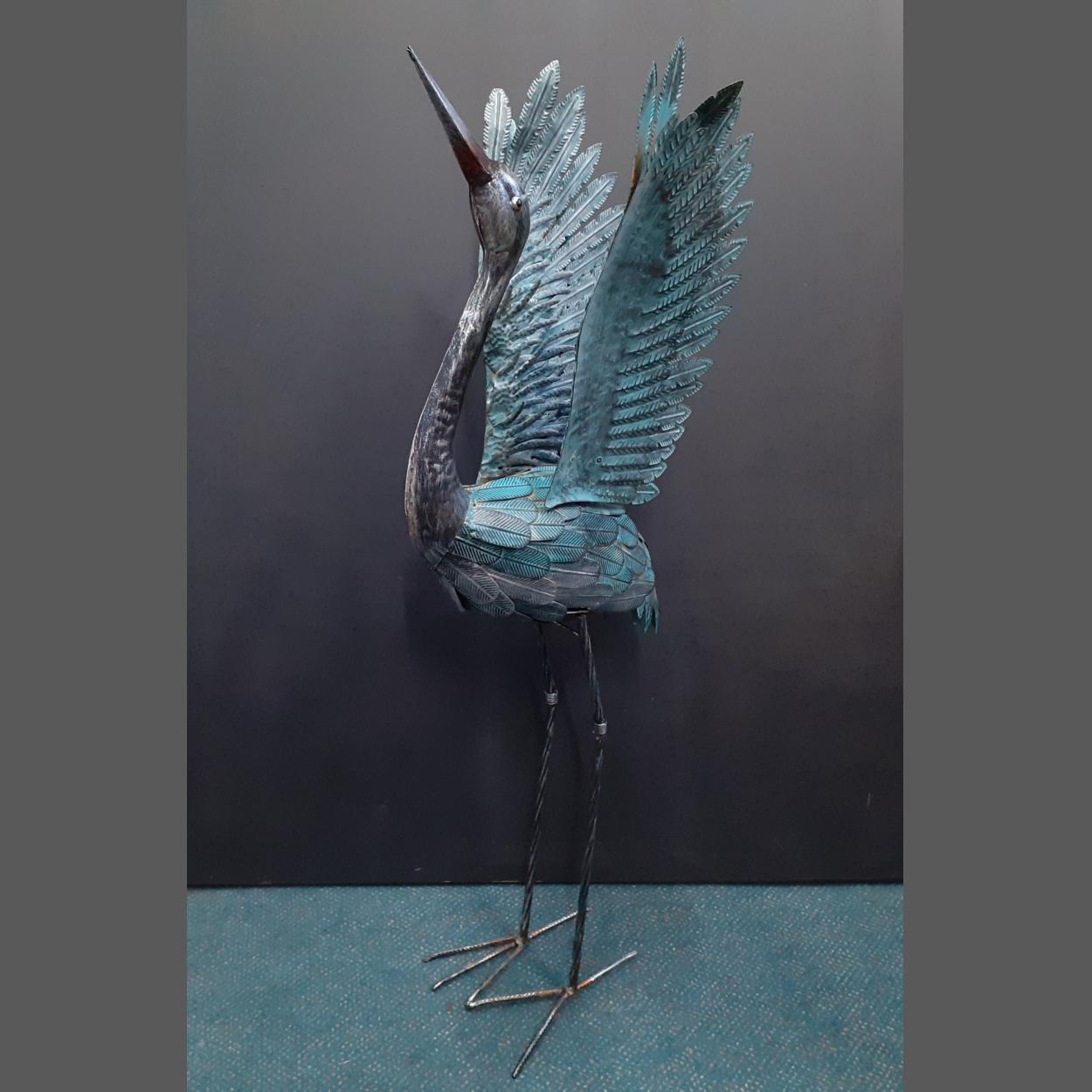 An impressive metal garden stork with a verdigris effect standing 100cm approx