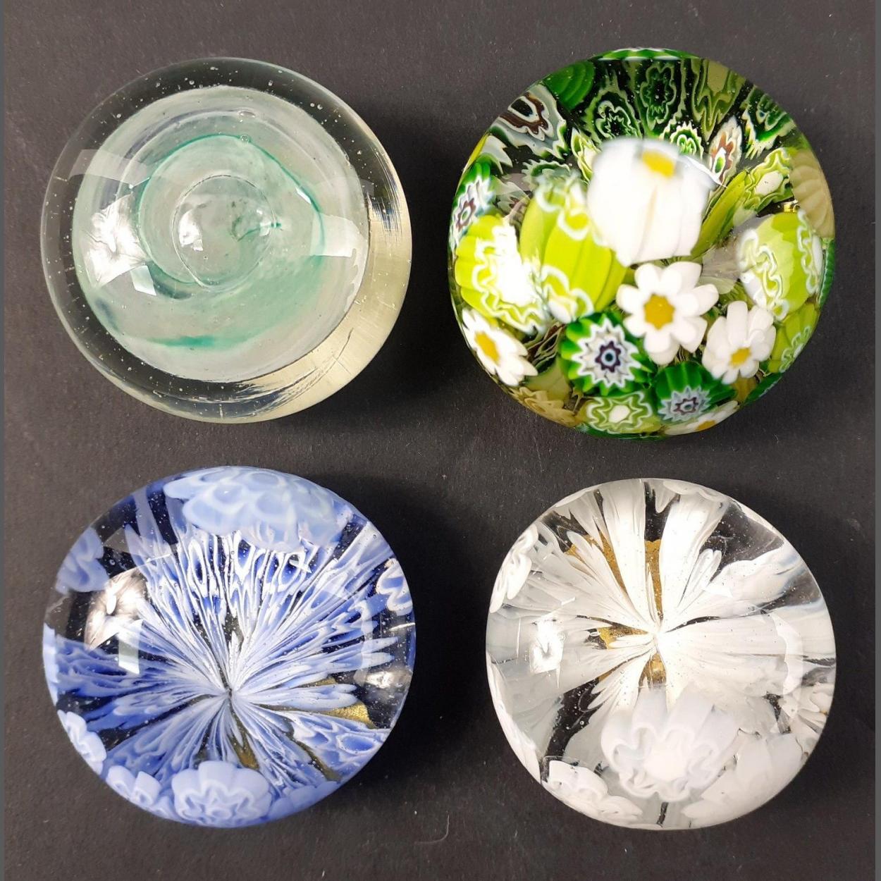 Four very small paperweights, one with Tweedsmuir sticker, largest 4cm across