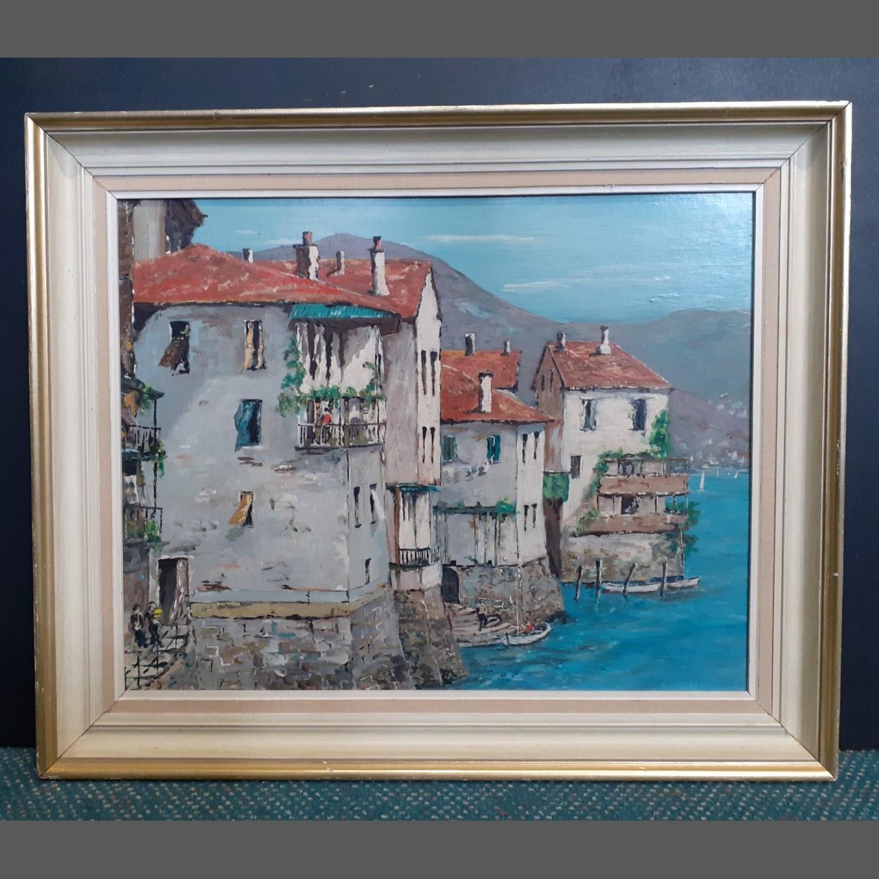 An original oil on board by A FRASER (possibly Alexander Fraser) entitles Lecco at Lake Como, frame size 56x47cm approx
