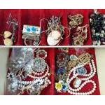 A cream faux leather jewellery box with gilt design and interior cantilever shelf with contents of costume jewellery 28x20x9cm approx