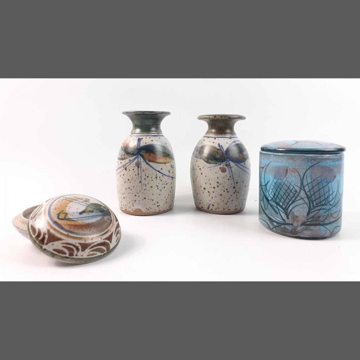 Four pieces of studio pottery to include a pair of vases 13 and 14cm high, with a matching lidded trinket dish 9cm approx and also a glazed pottery jar with lid decorated with thistles 10cm diameter 10cm height approx