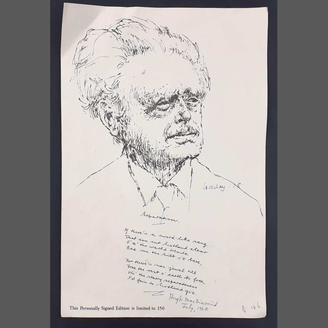 A limited edition (146/150) pen and ink sketch of HUGH MacDIARMID signed by both MacDiarmid and the artist LOVEDAY in 1968 with the poem Separatism. The work is A3 sized with some buffing to the edges. A piece of 20th century Scottish history.