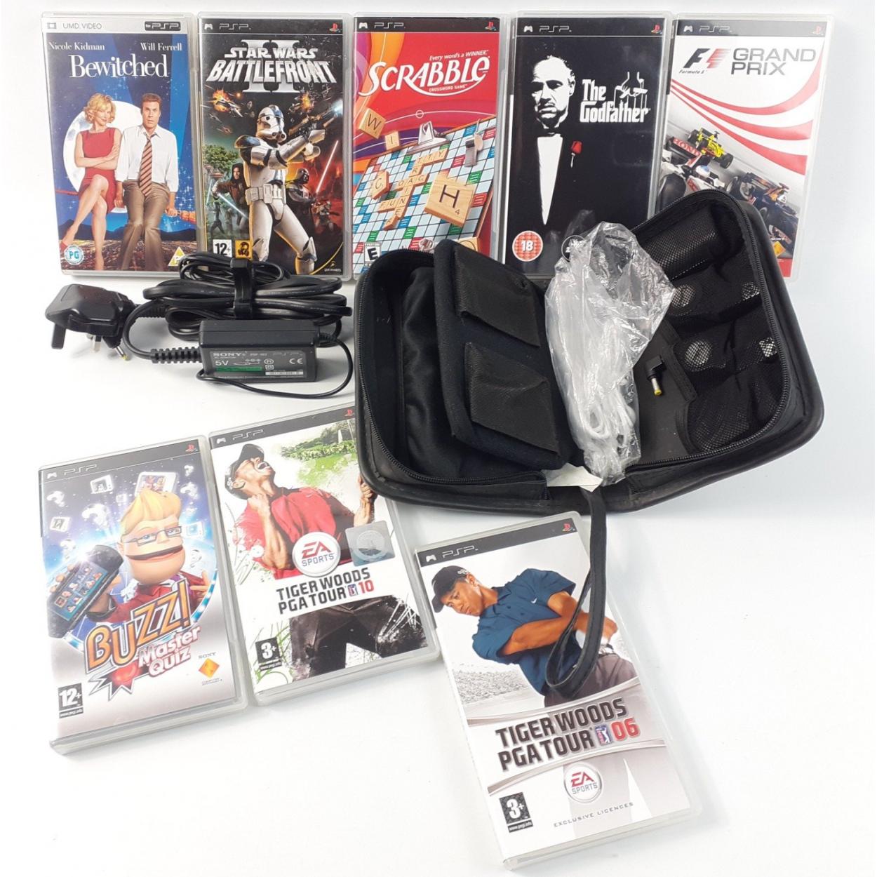 A PSP with zip-up travel case, charger and 7 games and 1 film to include Bewitched, Buzz Master Quiz, Star Wars Battlefront 2, Tiger Woods PGA Tour 6 and 10, Scrabble, The Godfather and F1 Grand Prix.