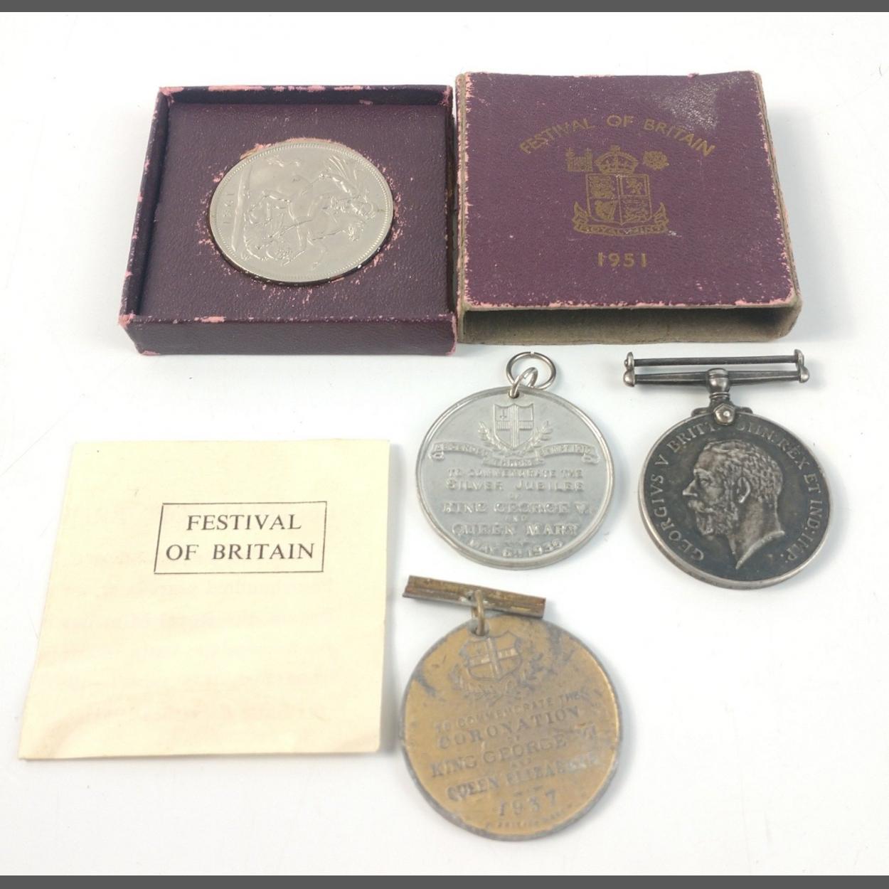 A WWI British War Medal to 113832 ASGT Skirrow, Royal Army Medical Corp. Also 2 x 1930s commemorative medallions and a 1951 Festival of Britain Crown