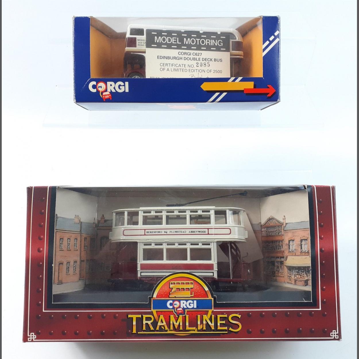 A boxed CORGI C627 limited edition Edinburgh Double Deck bus advertising Model Motoring, Broughton St, Edinburgh and a CORGI tram