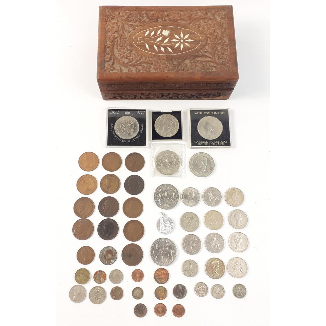 An inlaid carved wooden box containing a quantity of obsolete UK coinage and crowns