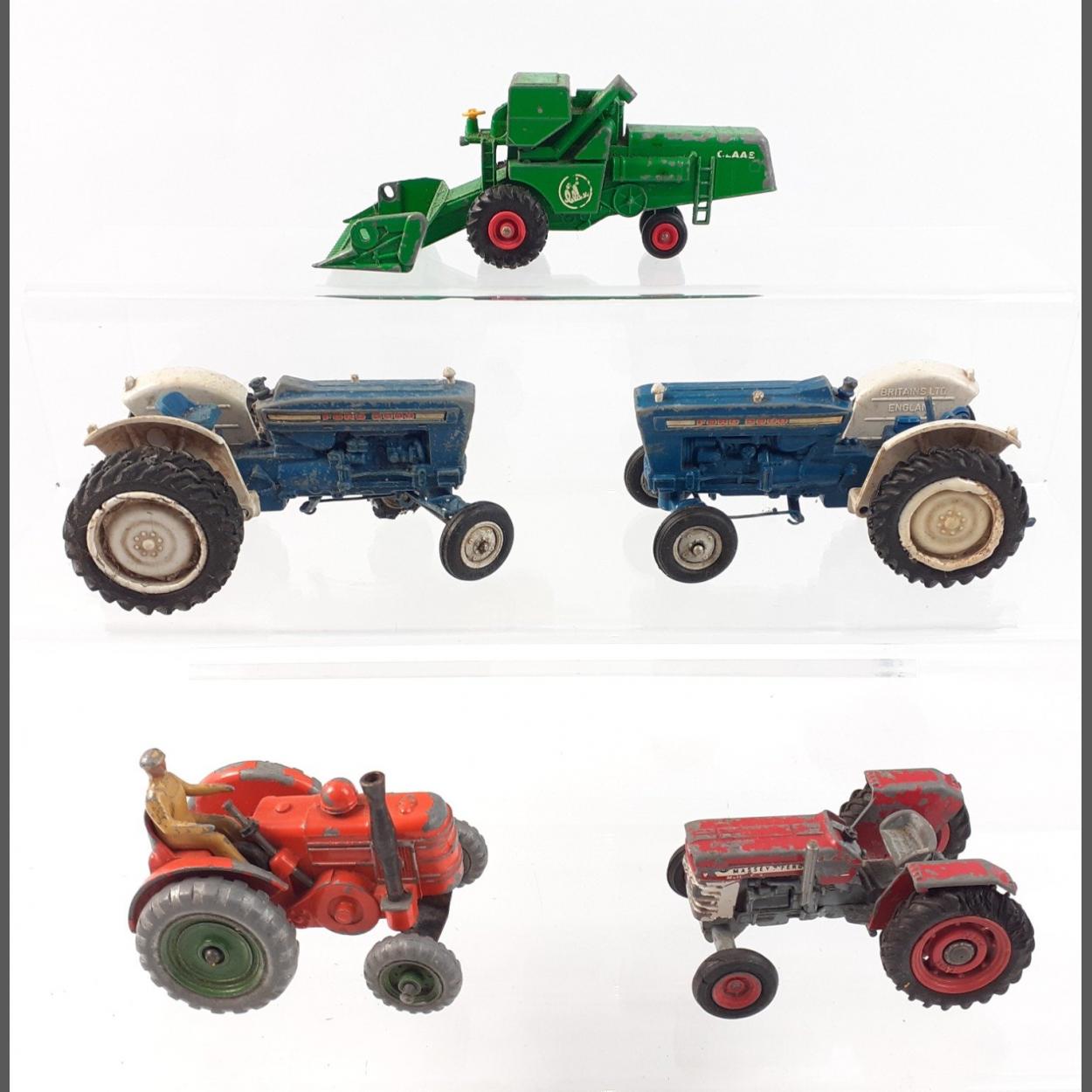 A selection of playworn DINKY agricultural diecasts to include a good condition steel wheel 301 Field Marshal tractor still with driver, 2 FORD 5000 tractors, and others