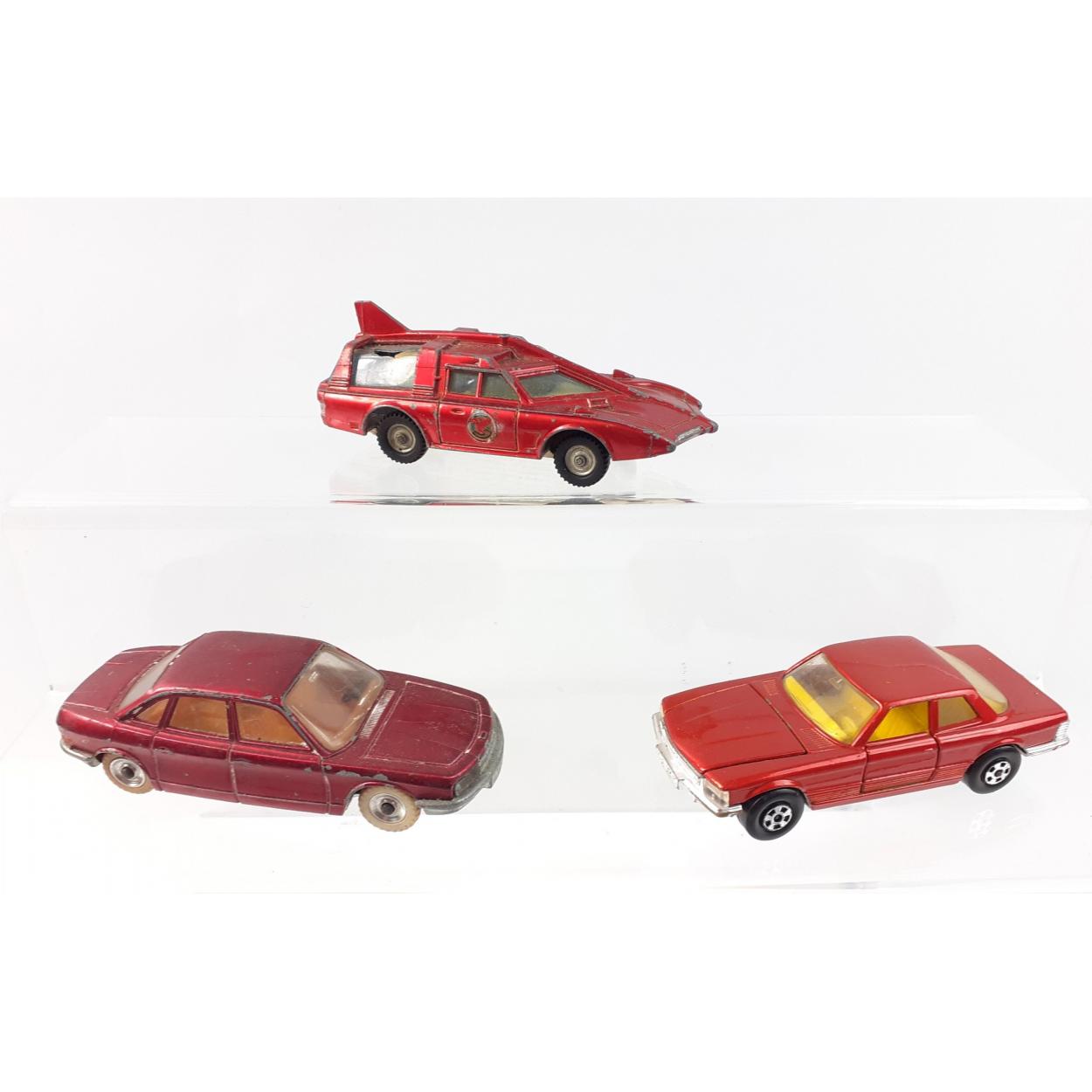 Three interesting playworn 1970s diecast models to include DINKY 103 Spectrum patrol car, DINKY NSURO80 with slightly corroded battery terminals and MATCHBOX 350SSLC Mercedes.