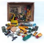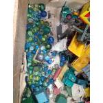 An old wooden storage box containing a quantity of older marbles, building blocks, and some playworn DINKYS including CORGI Carrimore, LESNEY king size Scammell dump truck and others