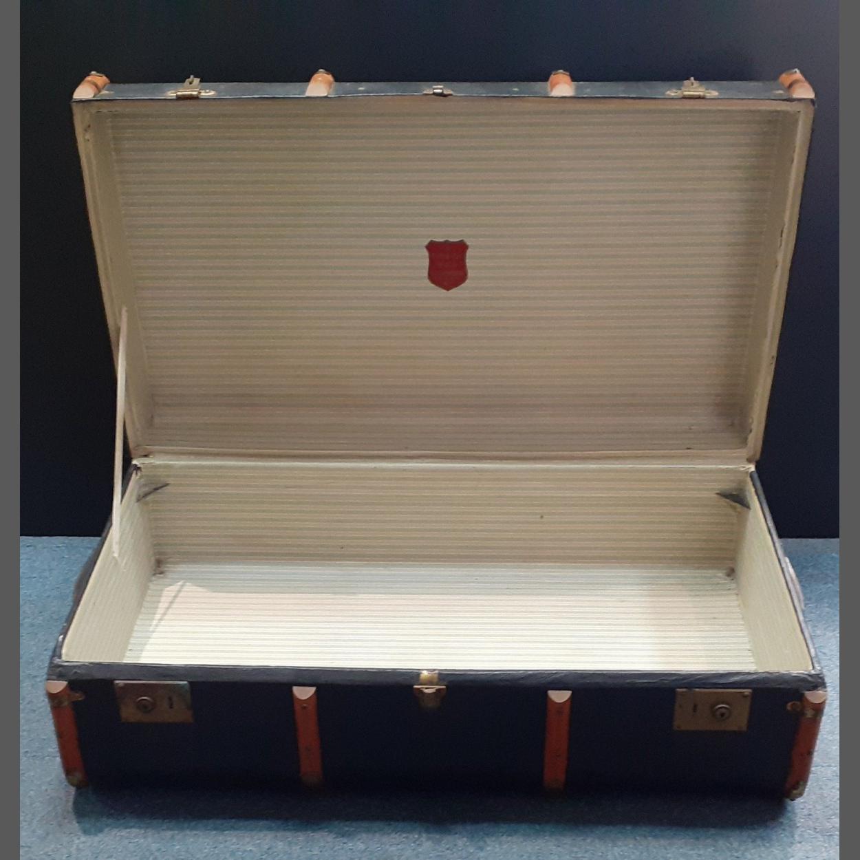 A large wood banded black travel trunk with brass corners 90x54x32cm approx