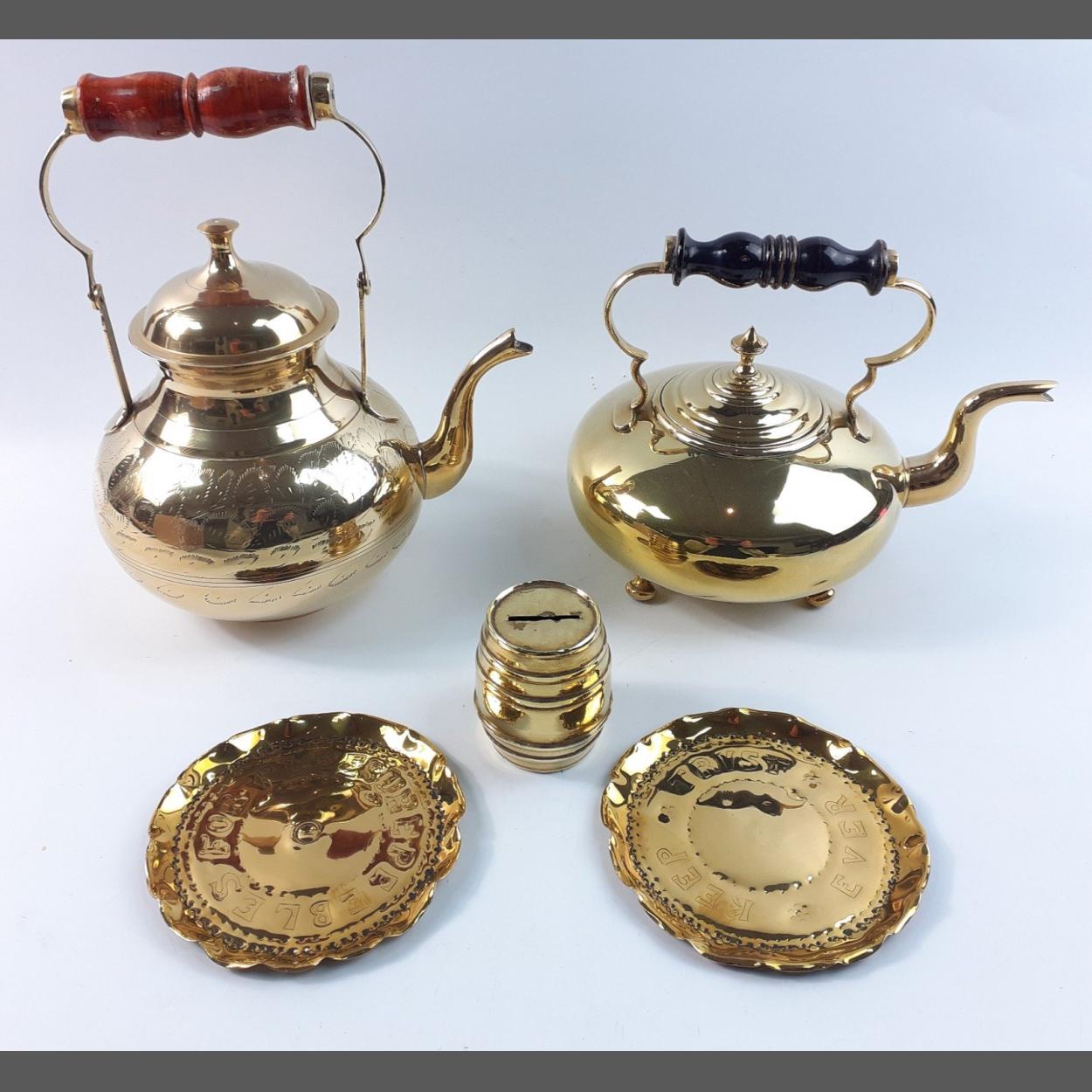 A small box of brassware to include 2 kettles with lids etc.