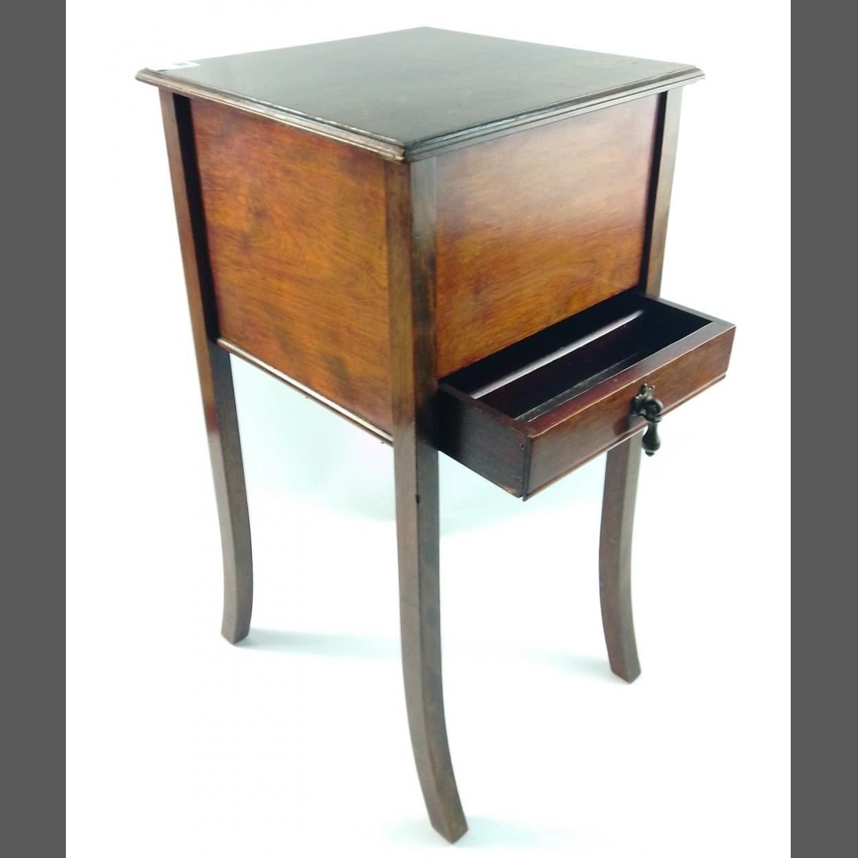 A small antique mahogany sewing box with satin lining on stand with contents 60cm tall