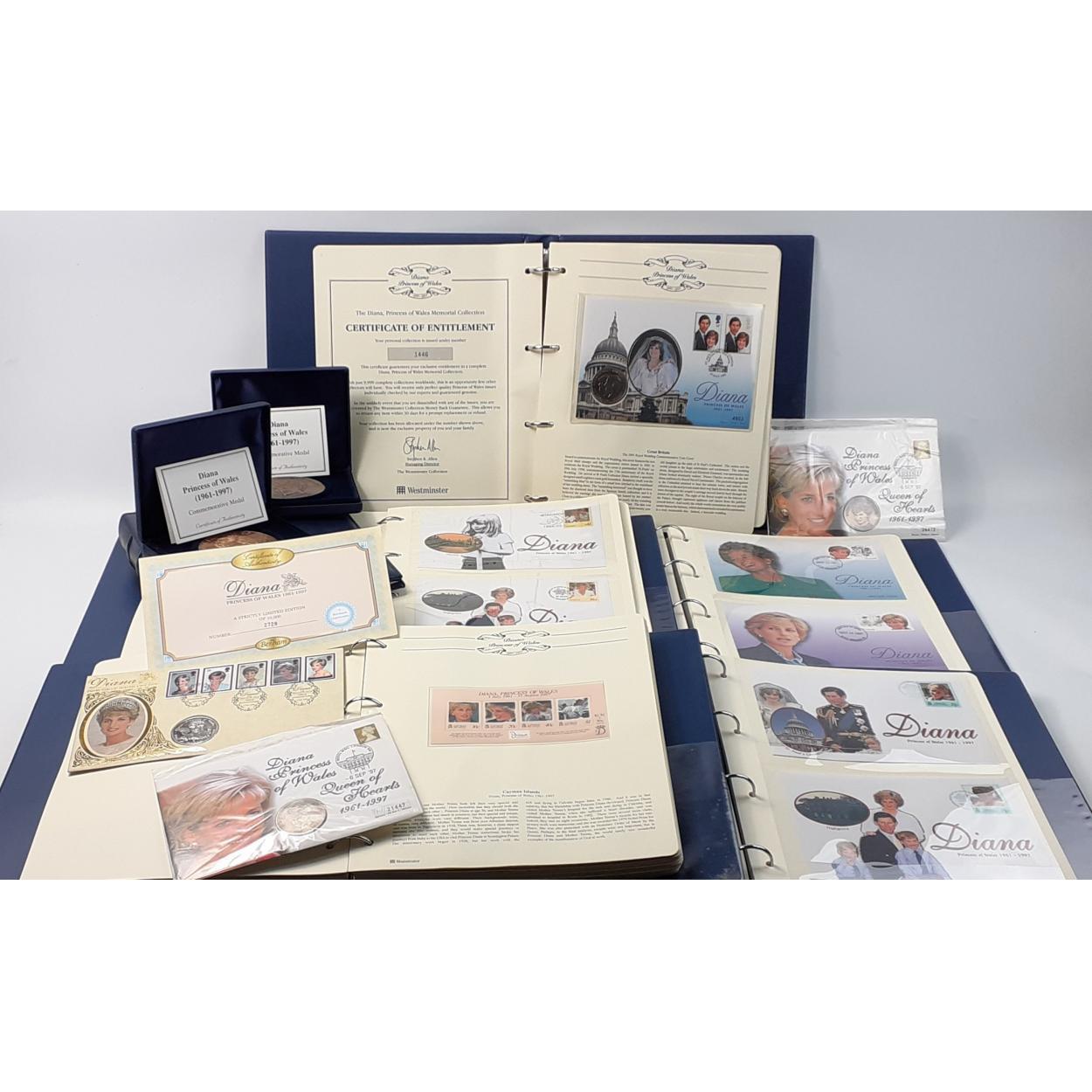 WESTMINSTER MINT Diana, Princess of Wales, three wonderful plush albums of covers, and two with some covers and coins as well as a BENHAM silk cover with coin, and 2 plush cased Westminster Mint medallions