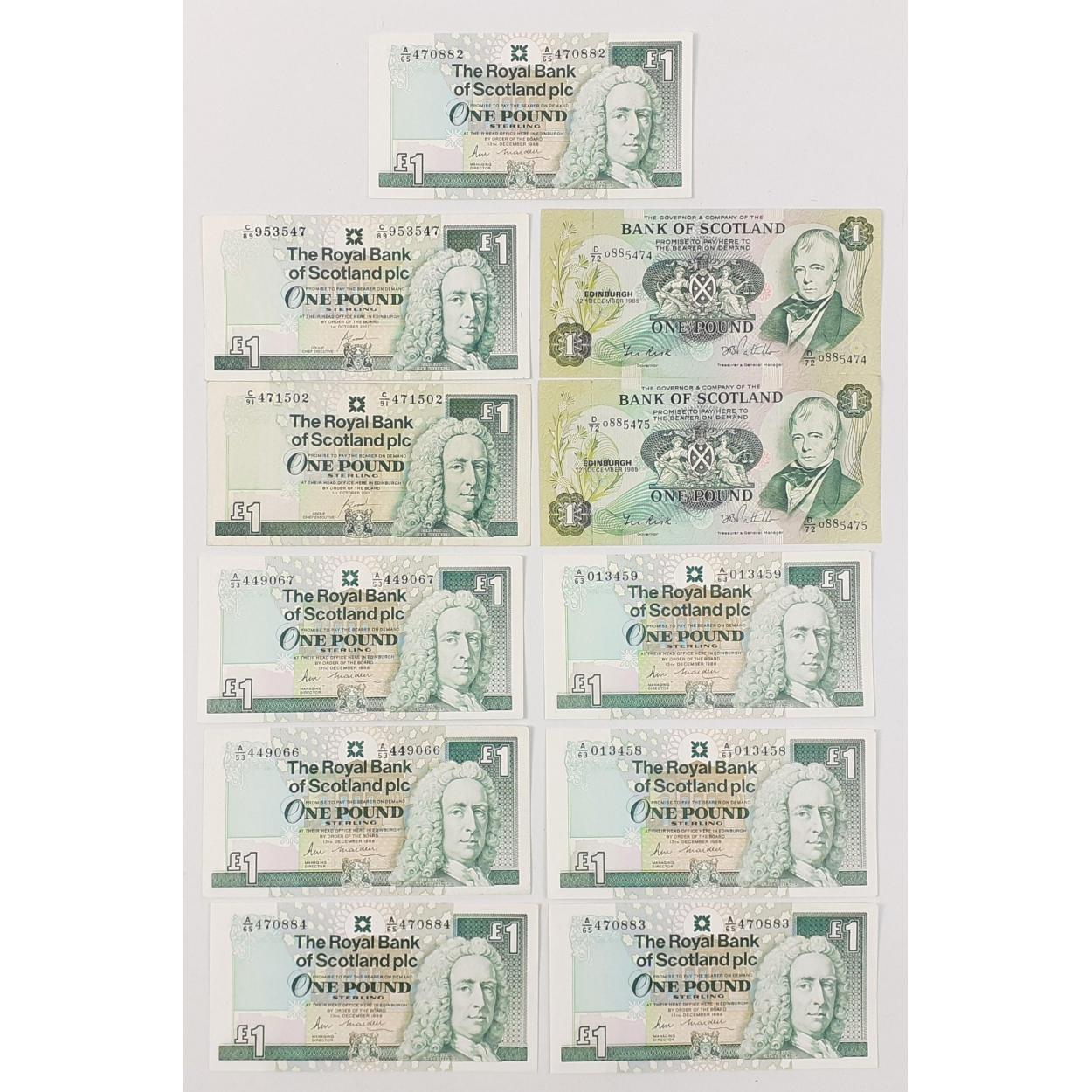 Eleven Scottish one pound bank notes of interest to include a sequential trios and three sequential pairs, all in good condition