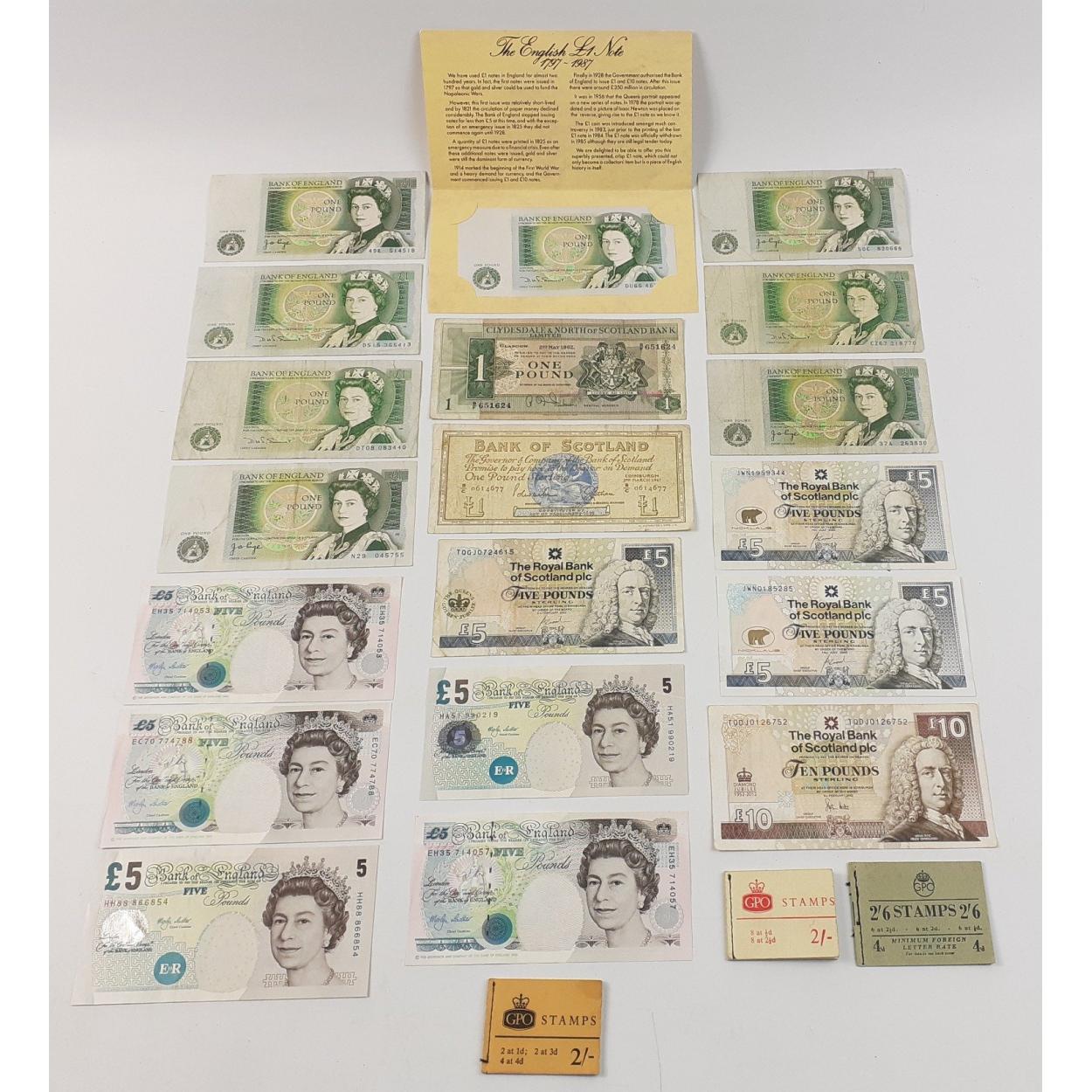 Bank notes of interest to include Bank of England one pound note in presentation folder, four crisp clean £5 Bank of England notes, 3 Jack Nicklaus Royal Blank £5 notes, and other collectable notes. Total face value £59. Includes some old GPO stamps