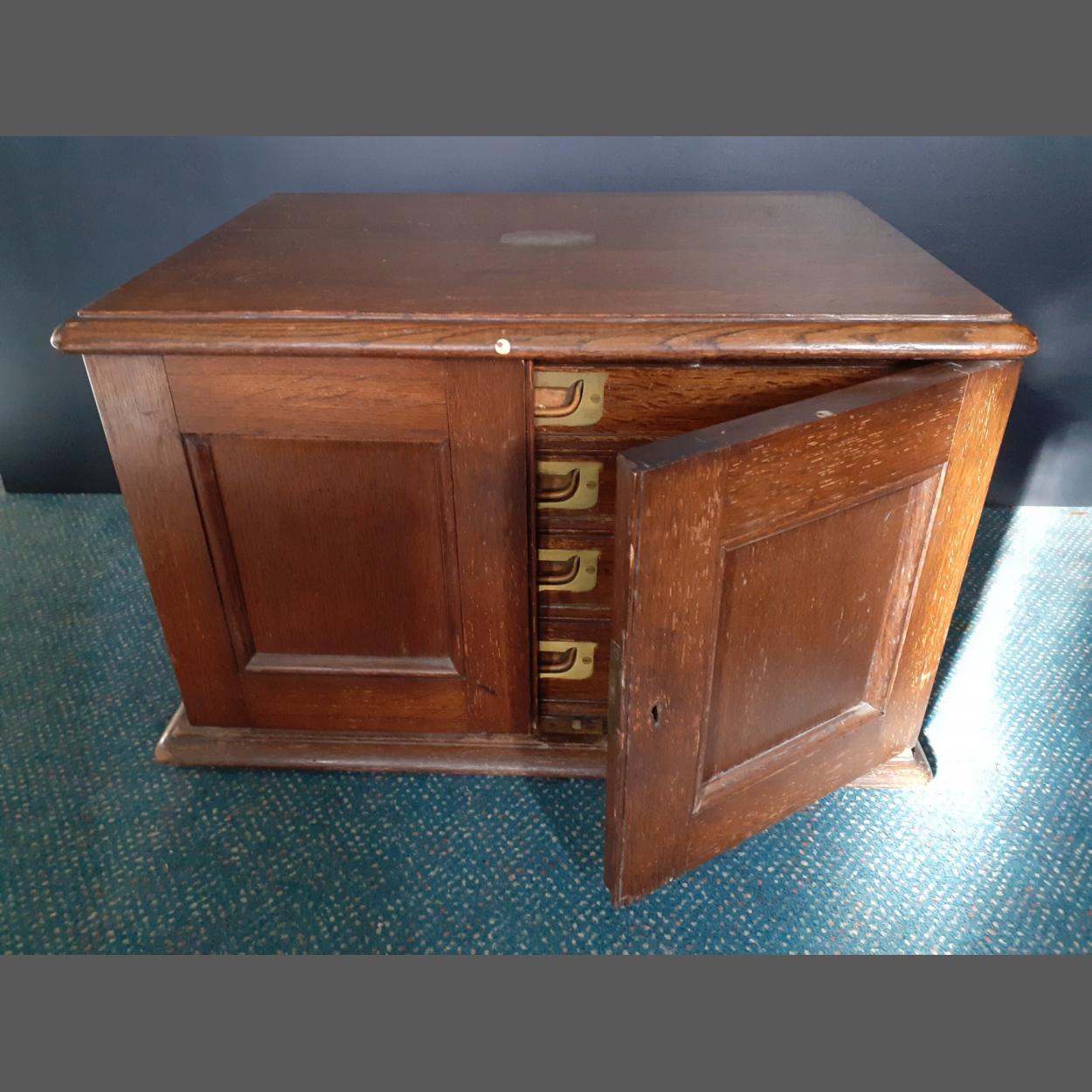 A superb large 4 drawer cutlery cabinet by THE ALEXANDER CLARK COMPANY LTD, Fenchurch St, London, with a substantial collection of quality plated cutlery. The case is magnificent although front lock is damaged. Engraved 'G' on the top matches the monogram on the handles of much of the cutlery
