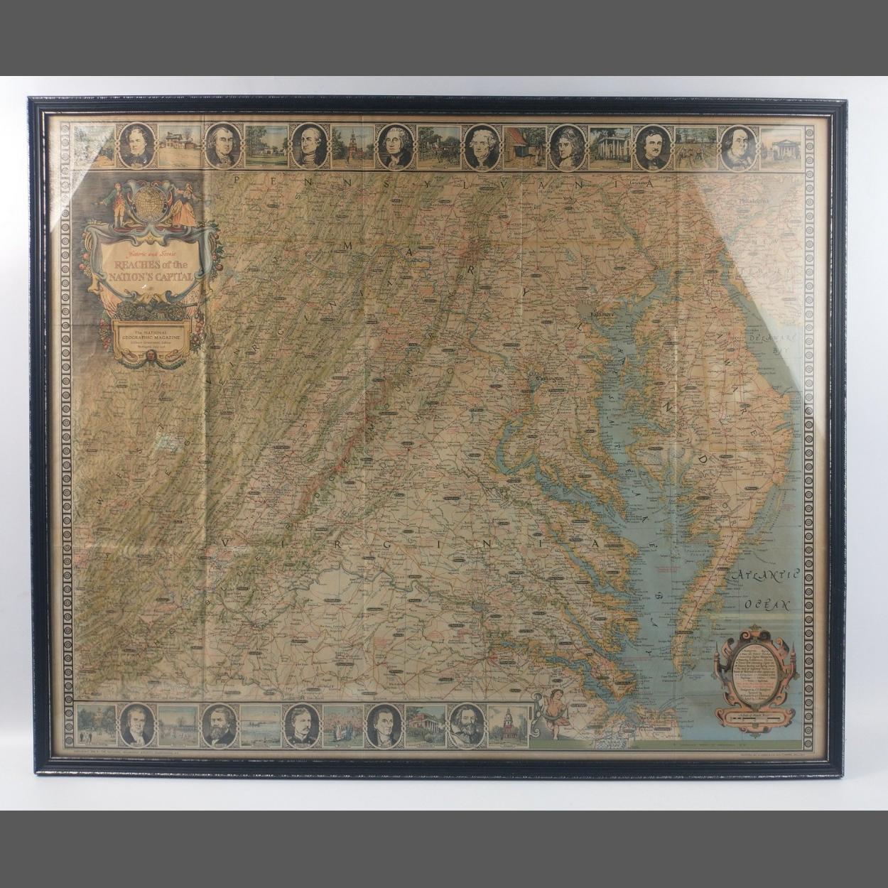 A 1938 National Geographic map entitled 'Historic and Scenic Reaches of the Nation's Capital' with vignettes to border. A very impressive piece. With some light folds but very well framed 82 x 68cm approx