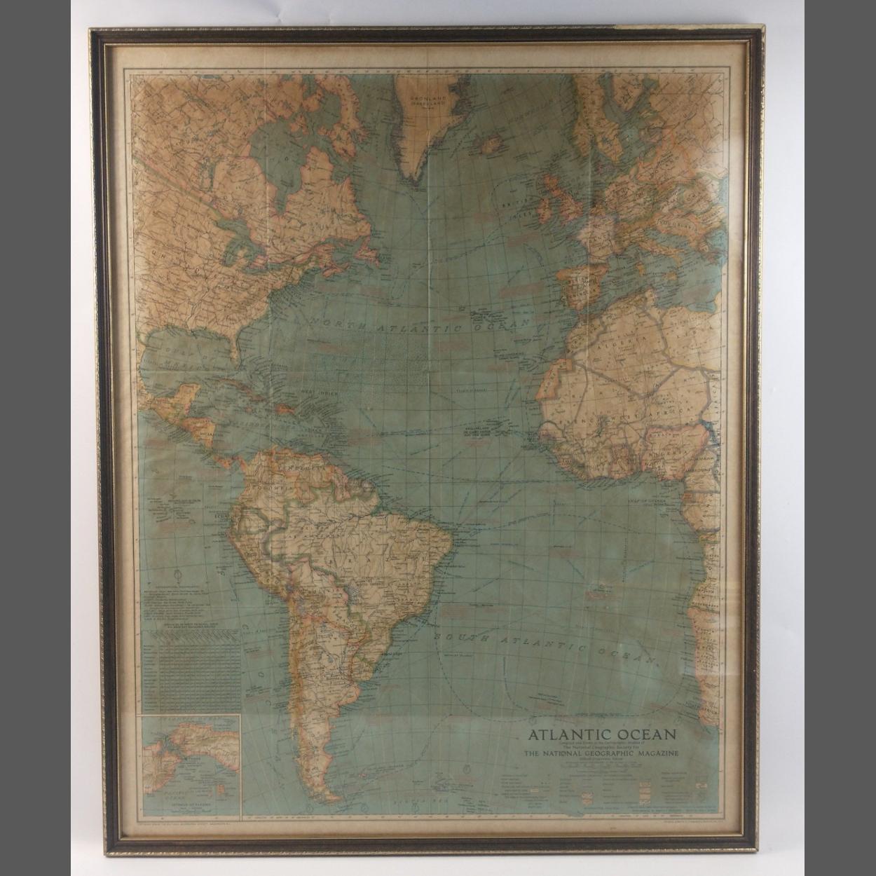 A large framed National Geographic map of the Atlantic Ocean, dated 1939. Exceptionally well framed 82x66cm approx