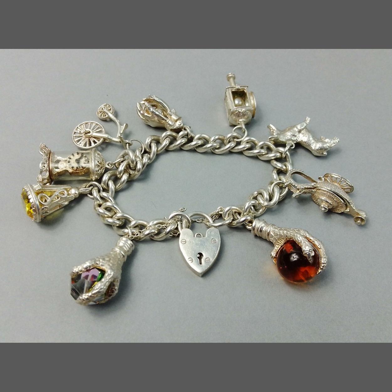 A sterling silver hallmarked charm bracelet with ten wonderful articulated charms and a padlock clasp to include ball and claw with orange stone, Aladdin's lamp, a corgi, carriage lamp, a pair of clasped hands with a pram inside, penny farthing bicycle with moving wheels, mantle clock and others. Total gross weight 65.35g approx