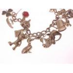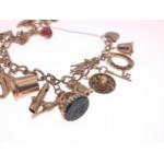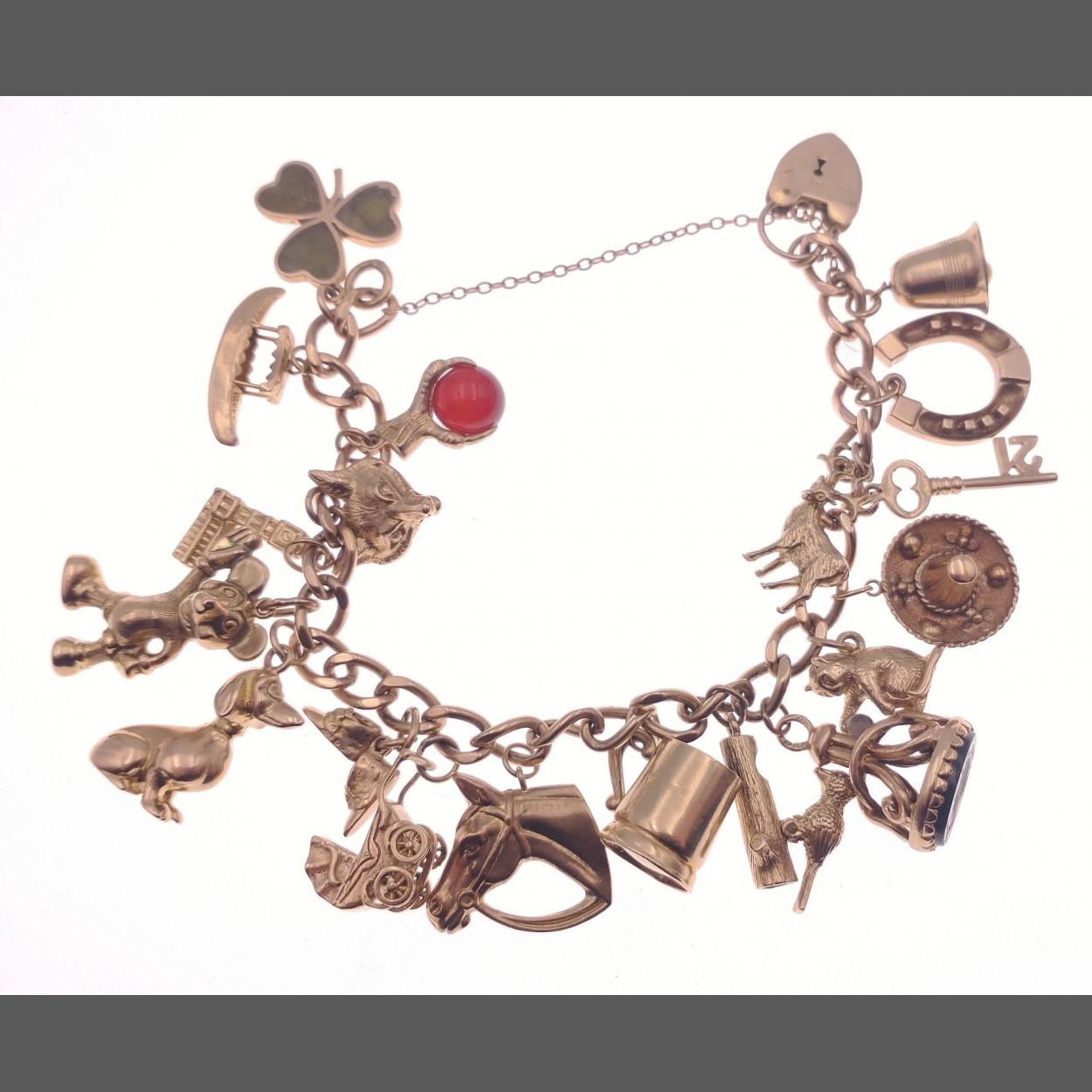 A 375 stamped gold chain bracelet with padlock with no fewer than 19 charms to include a horse, horseshoe, Mickey Mouse, dachshund, articulated woodpecker, sombrero and much else. Gross weight 59.25g approx
