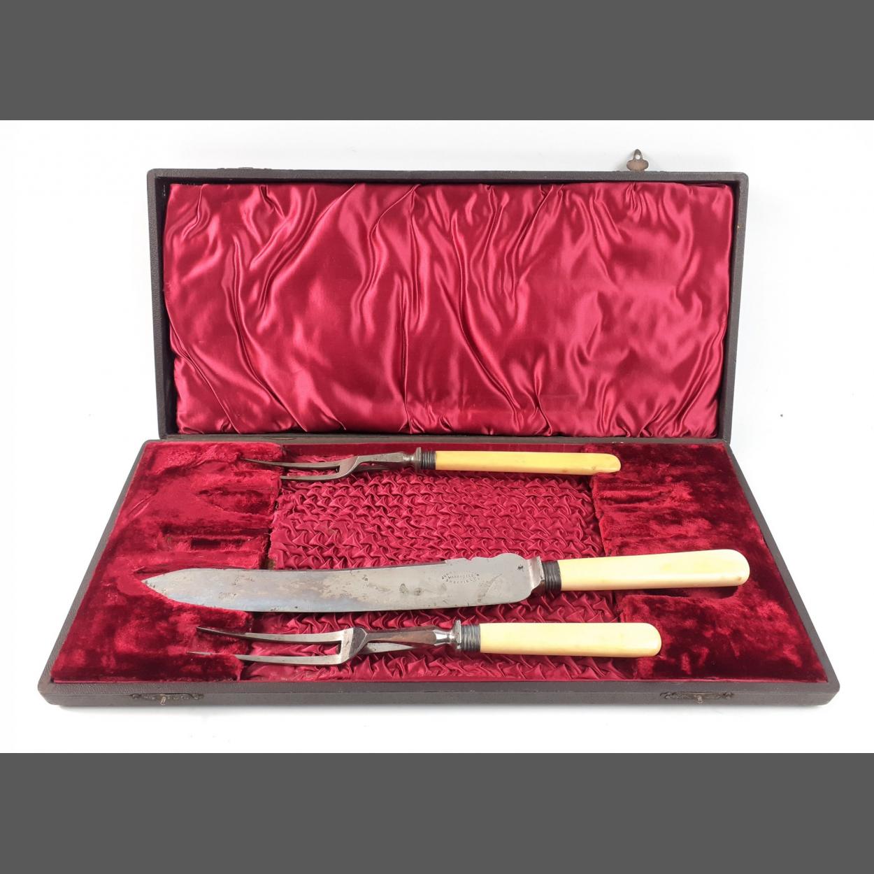 A carving set by John Anderson with silver collars hallmarked for Sheffield. Steel missing in presentation box with detached lid