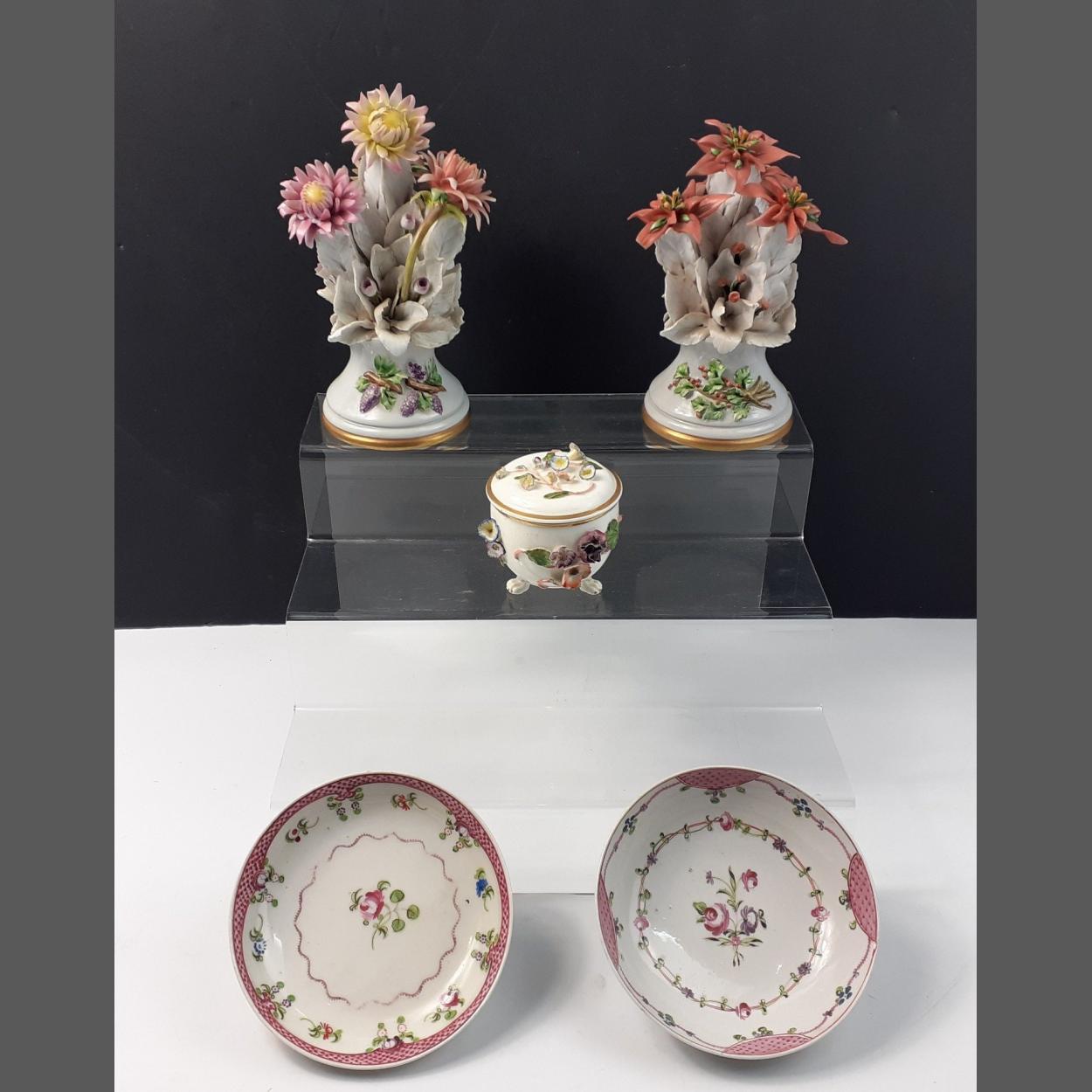 A small ceramic collection to include 2 CAPODIMONTE flower arrangements 20cm high approx, a BLOOR DERBY trinket pot and two 19th century dishes. Each has minor flaws but generally in good order for their age. Believed to have belonged to the late Dowager Lady St Oswald (of Nostell Priory until 1999)