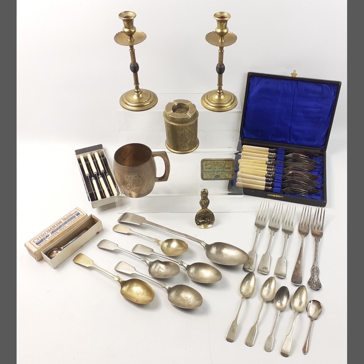 A mixed lot to include various EP flatware, an Indian brass ashtray, a plated tankard, a pair of brass candlesticks (21cm high)