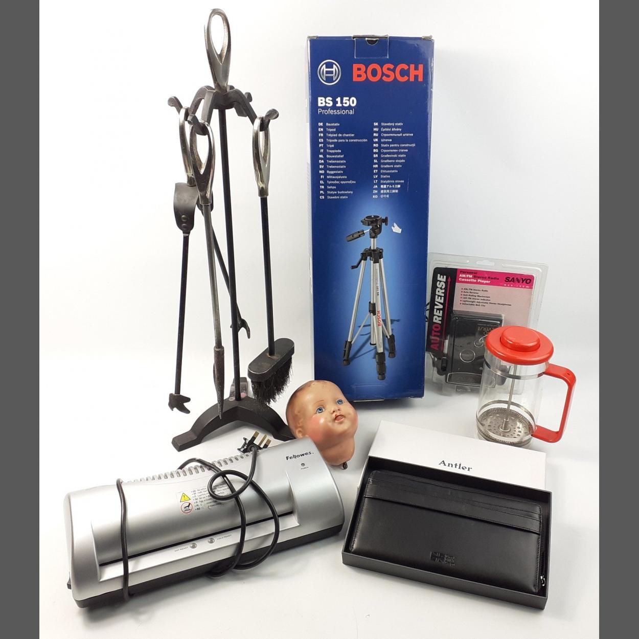 A mixed lot to include a BOSCH BS150 professional tripod in a box, a FELLOWS laminator, a cafetiere, a doll's head and a part fire irons set