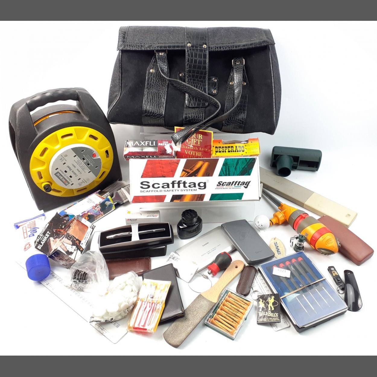 A mixed lot to include a 20m 4 socket cable reel, various tools, golf balls, rules, and an Elizabeth Arden handbag with tags
