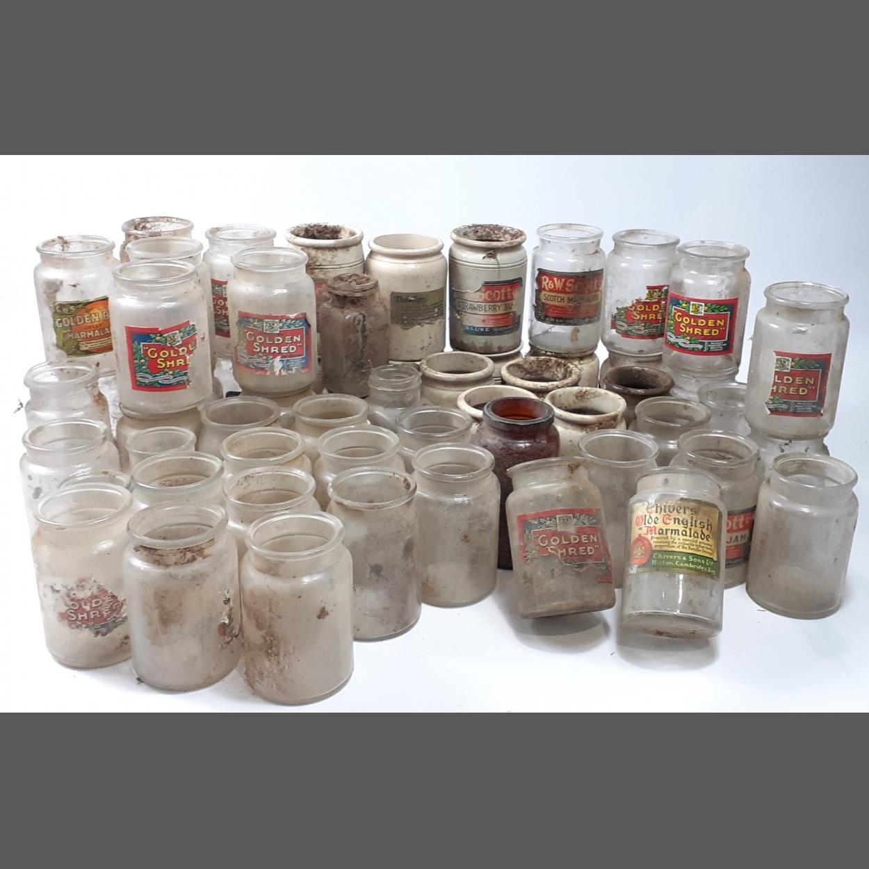 A quantity of large vintage jam jars useful for upcycling projects, tealight holders etc