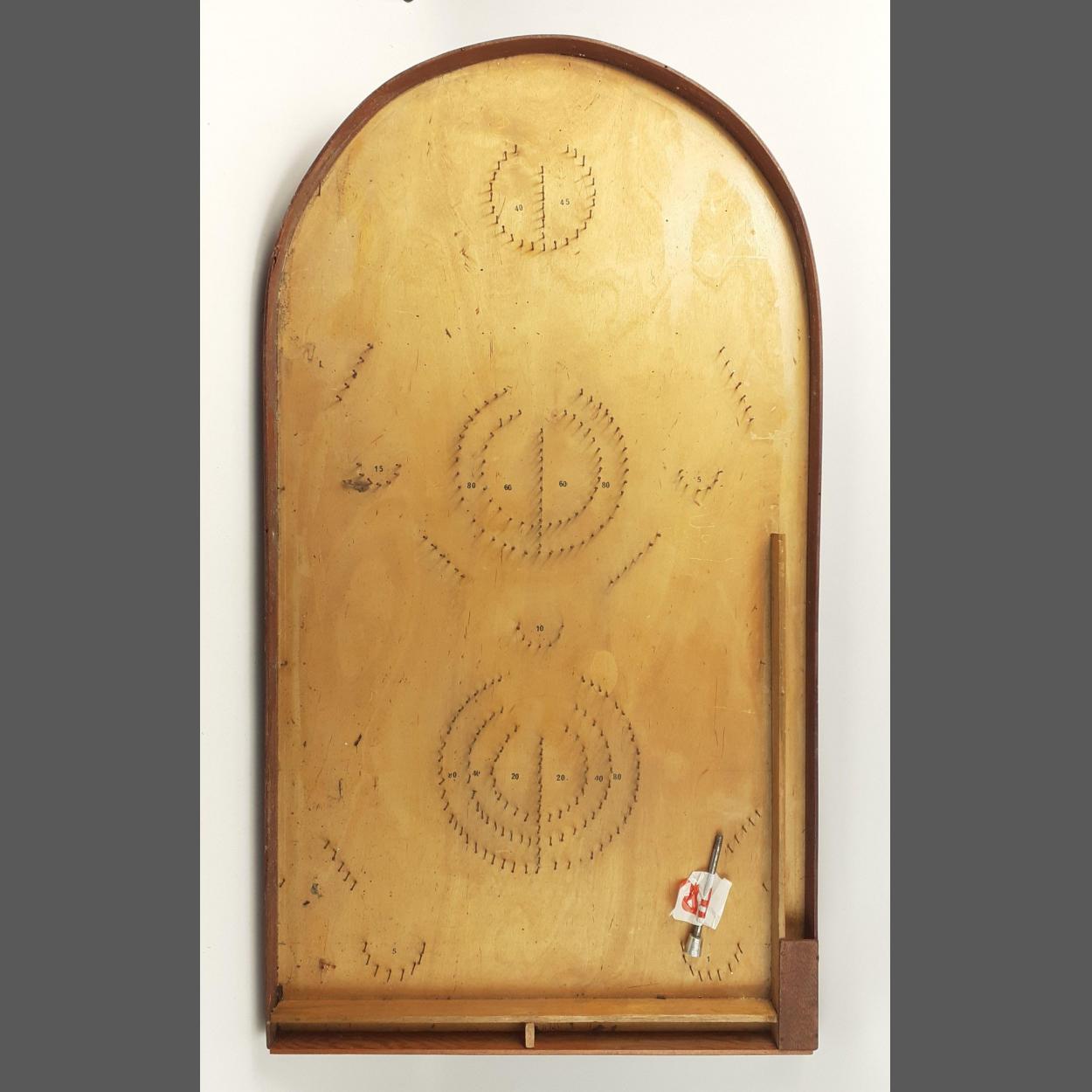 A vintage wooden bagatelle board with nails measures 86x47cm