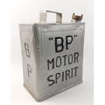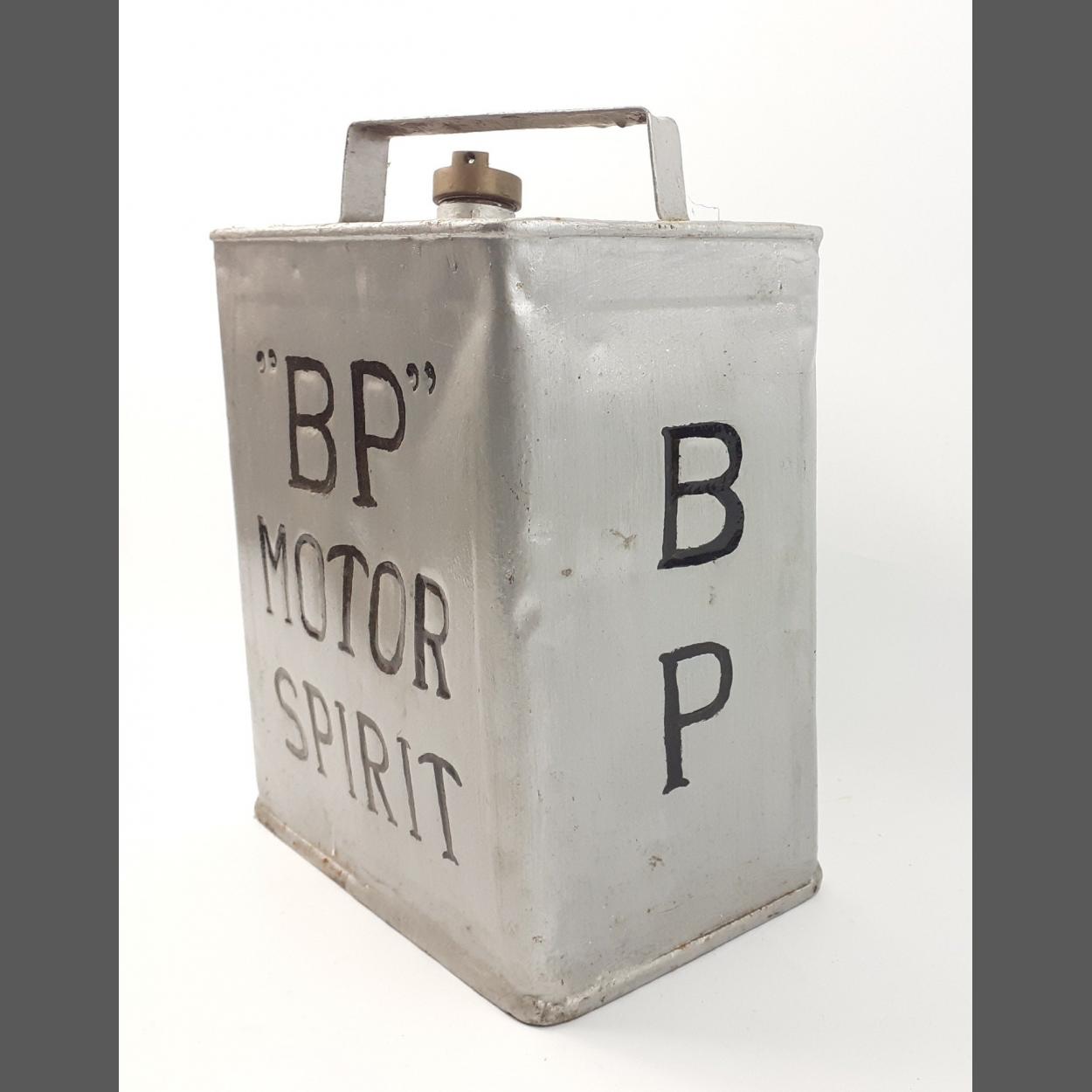 A "BP" Motor Spirit 2 gallon can overpainted in silver with black lettering