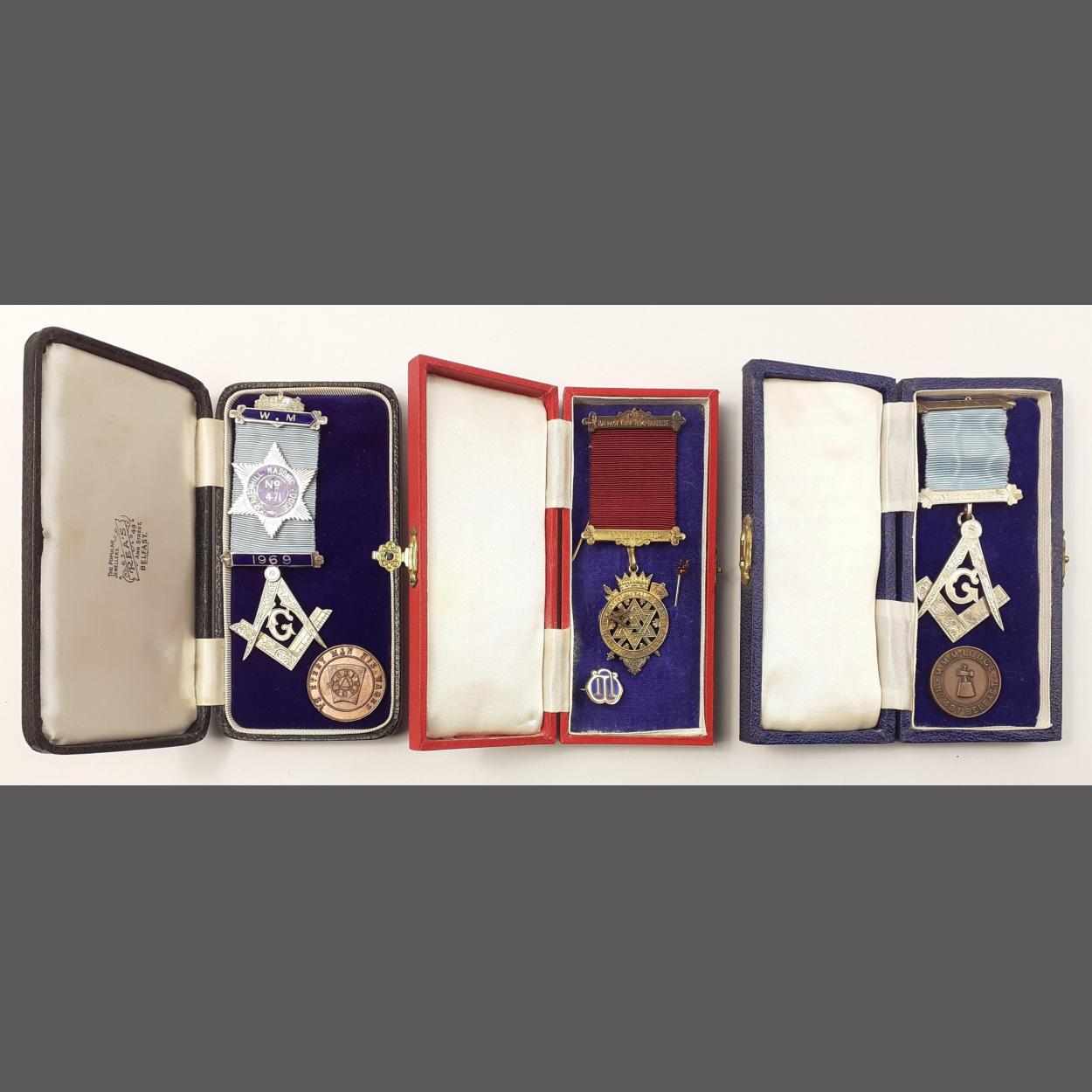 Three cased MASONIC jewels, 2 silver, to include Ravenhill Lodge 471, Worshipful Master 1969, Lodge 275 named with a 481 Belfast penny, and a bronze Temperance medal Belfast City