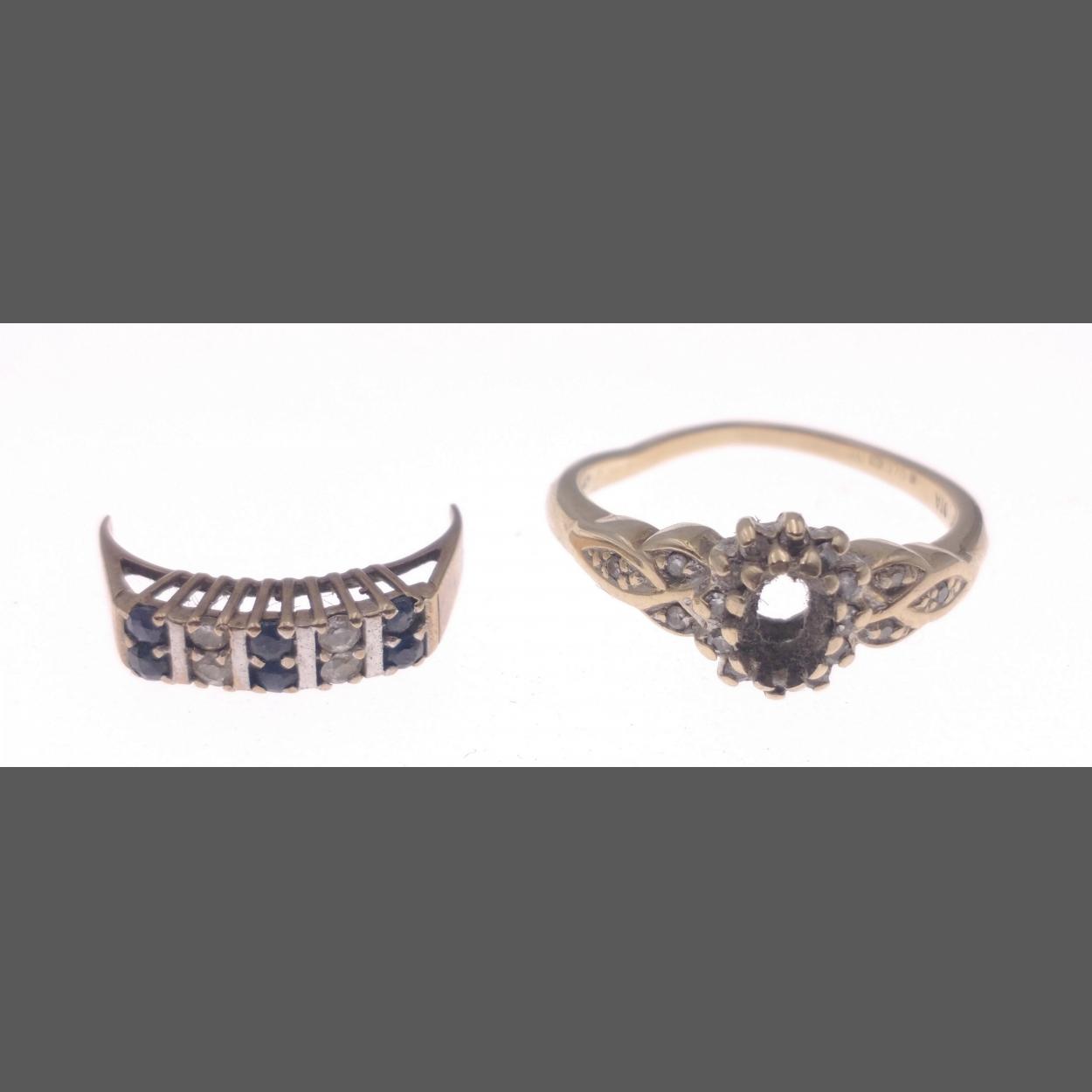 A fully hallmarked 375 gold band missing centre stone, gross weight 3.4g approx, size U and a part, unmarked ring with small white and blue stones gross weight 1.5g approx