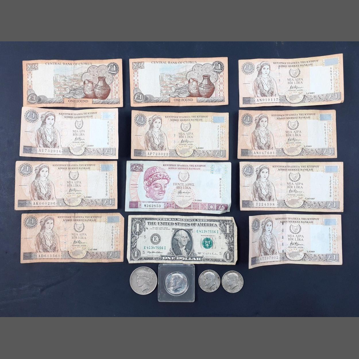 Of numismatic interest - a quantity of old paper money from Cyprus etc, and 3 x 1964 silver half dollar