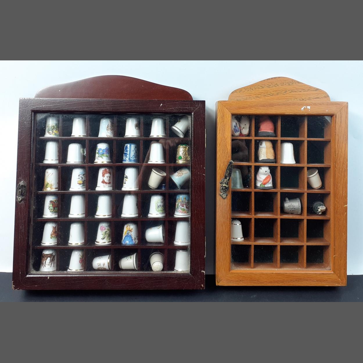 Two small wall display cases containing over 40 collectable thimbles