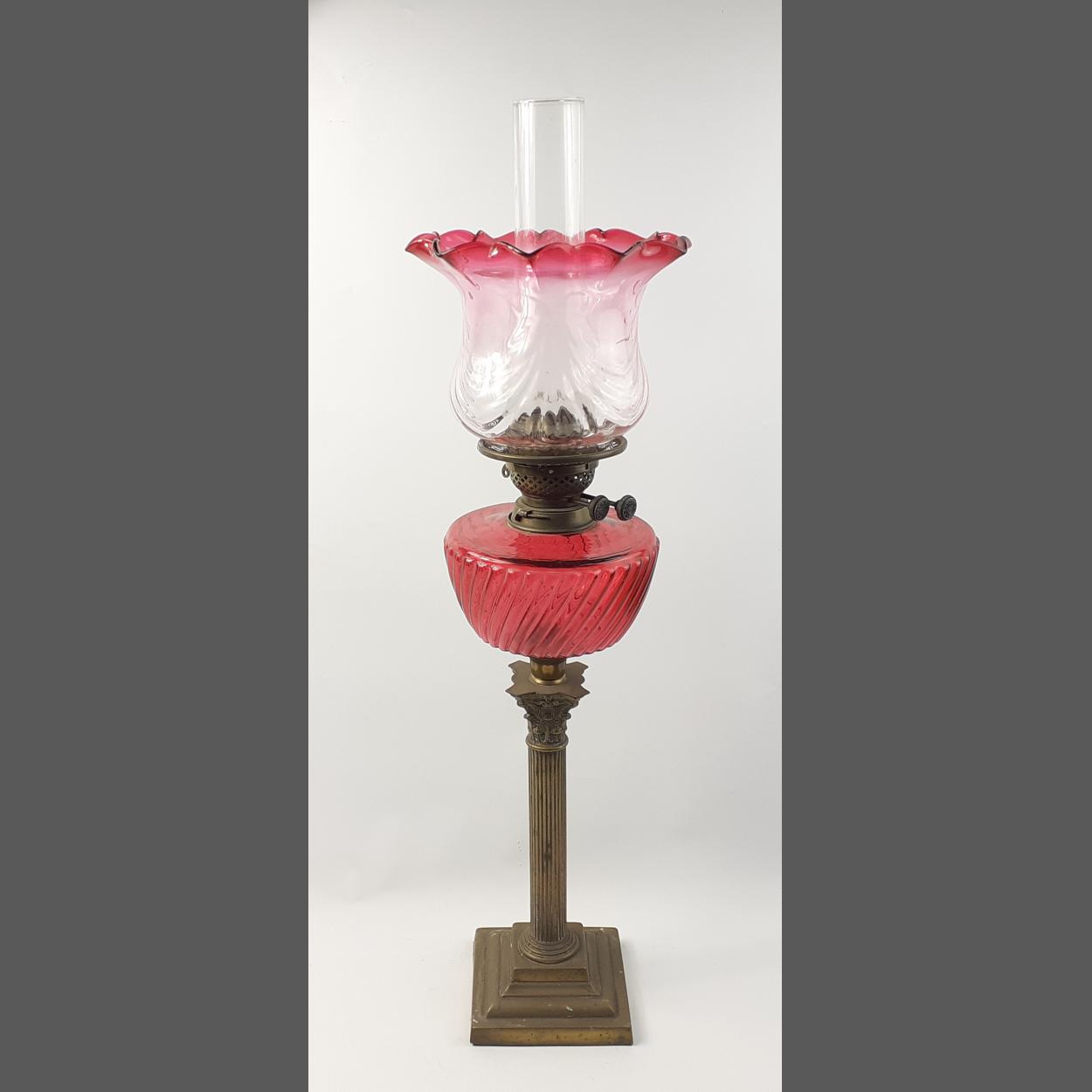 A majestic oil lamp with cranberry glass shade and reservoir on a brass column standing 70cm high. Wick control marked Best Duplex.