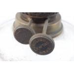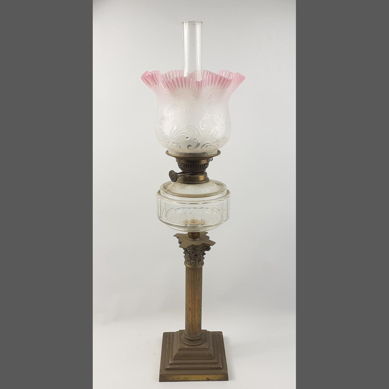 A stunning oil lamp with rose coloured shade and clear glass reservoir standing 70cm tall on a column base. Maker's mark Lewtas.