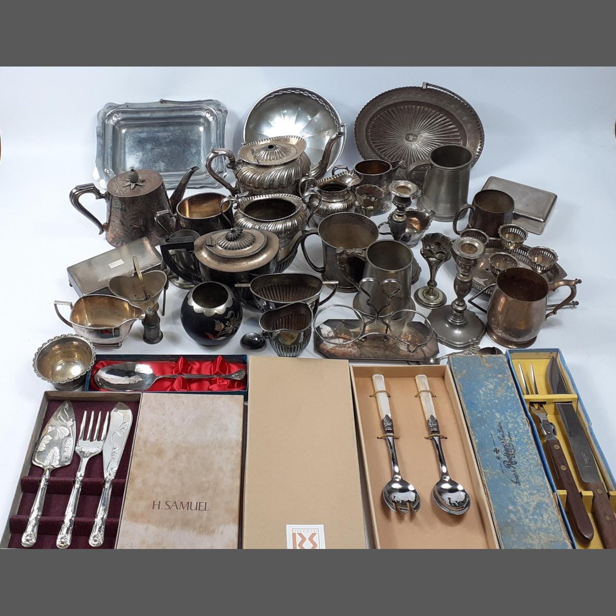 A mixed lot of EP to include trays, tankards, teapots, bowls, and 2 plated cigarette boxes etc