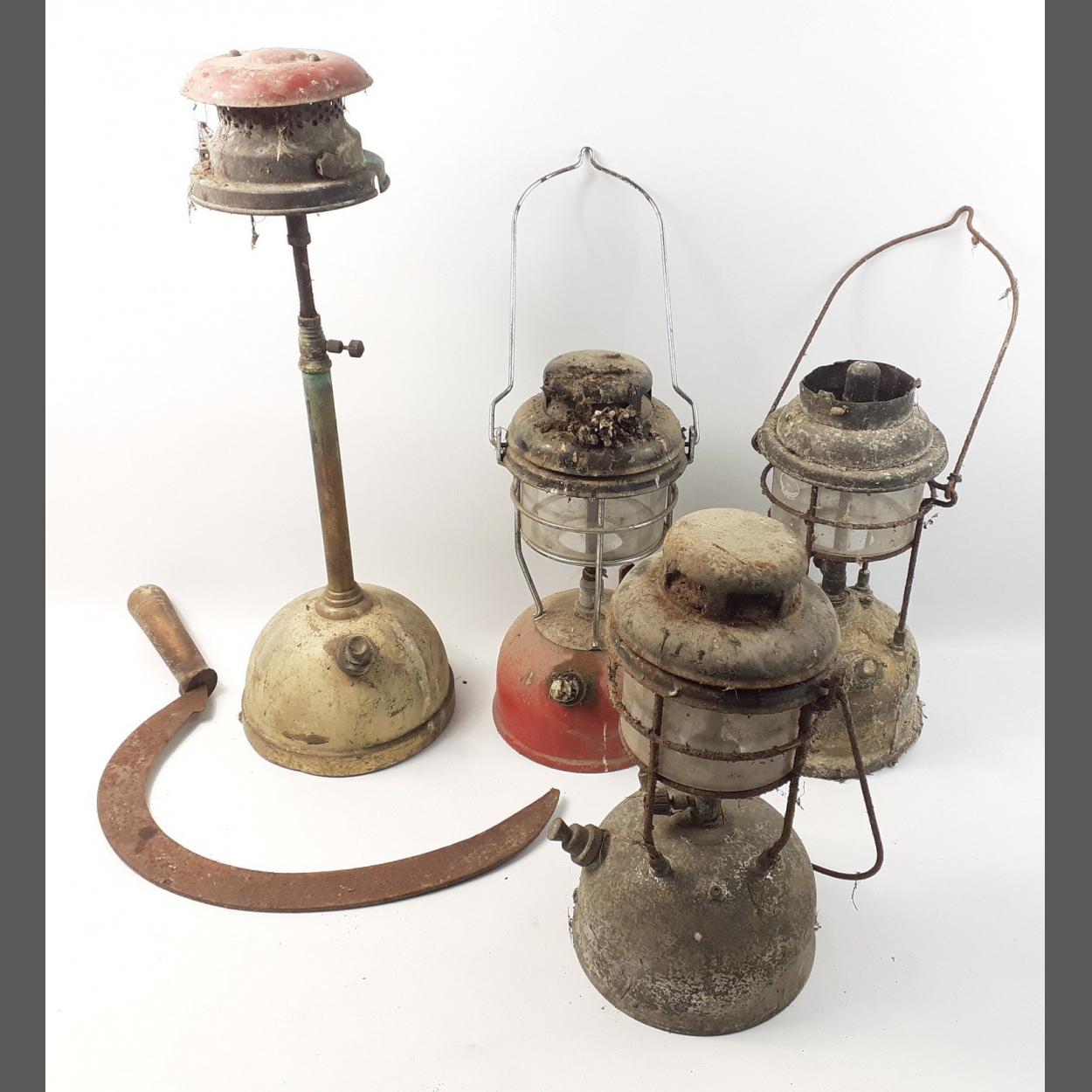 Three barn find TILLEY lamps, a lamp, and a scythe,