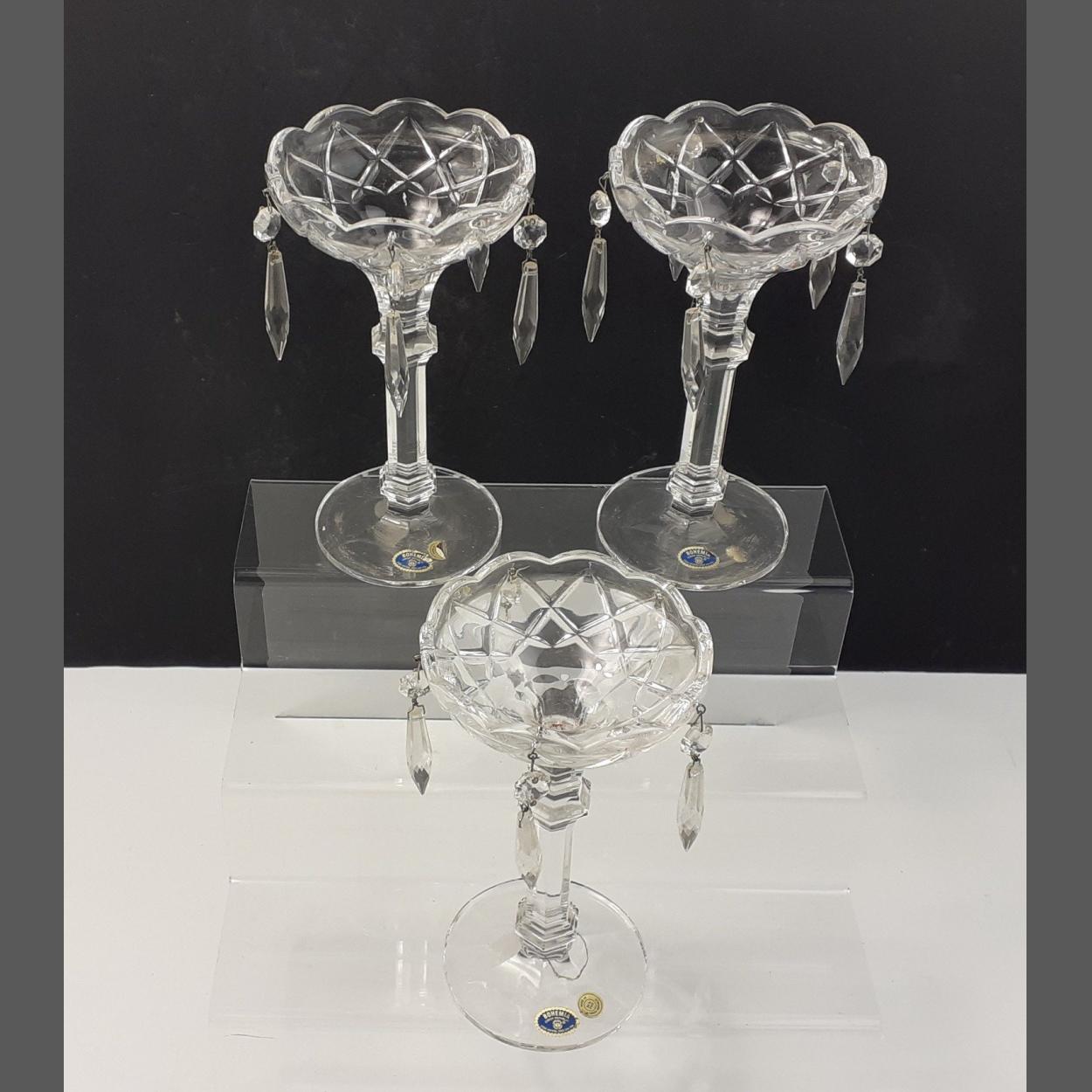A set of three Bohemia lead crystal table lustres each 20cm tall in good order with one missing drop