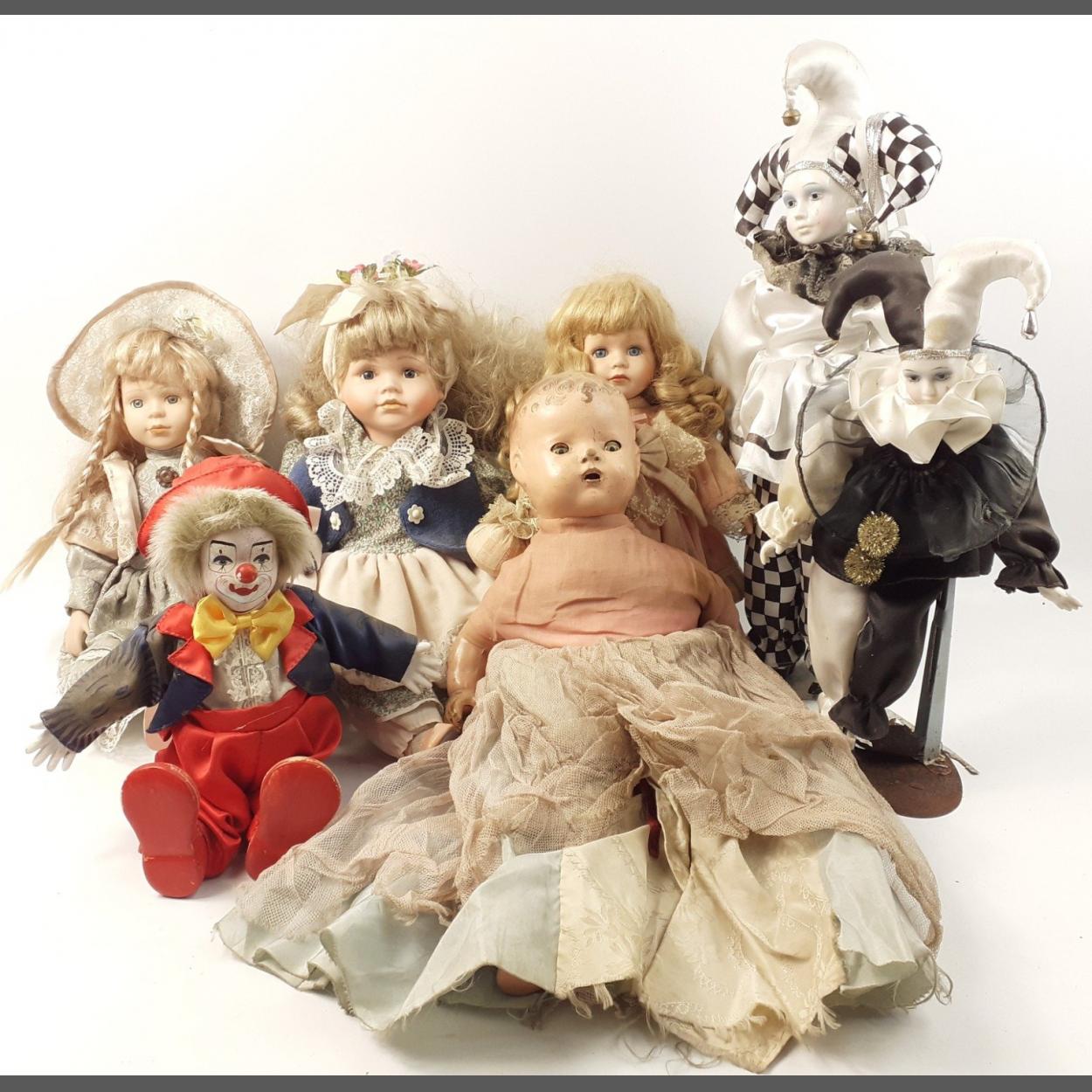 A bag containing a selection of old decorative dolls some bisque faced and including some Pierrot figures. Dusty from storage.