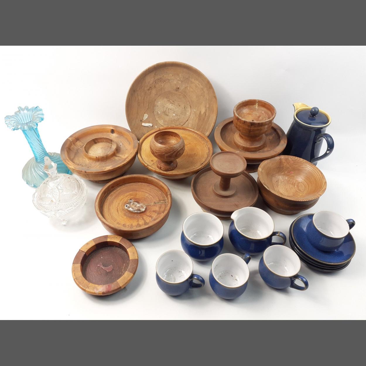 A mixed box to include some blue glazed DENBY tableware, treen items, glassware etc